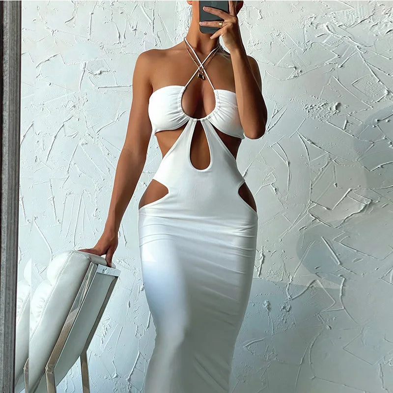 Lunivop Women Sexy Women Summer Black Sleeveless Strap Backless Hollow Out Split Long Dress Halter Streetwear Slim Elegant Party Club