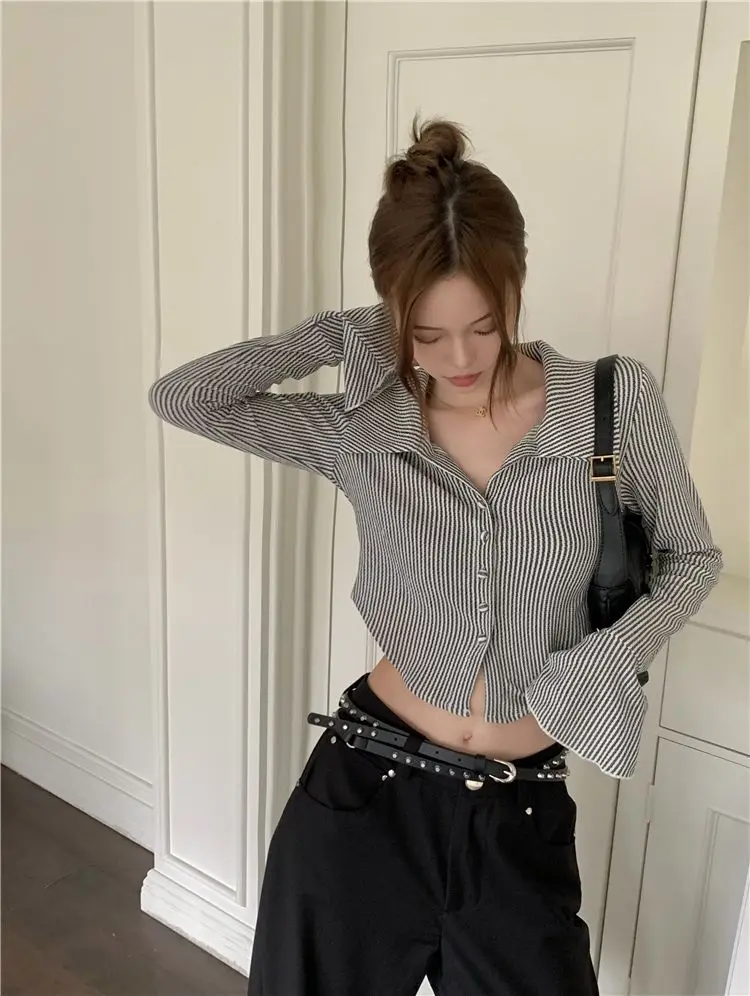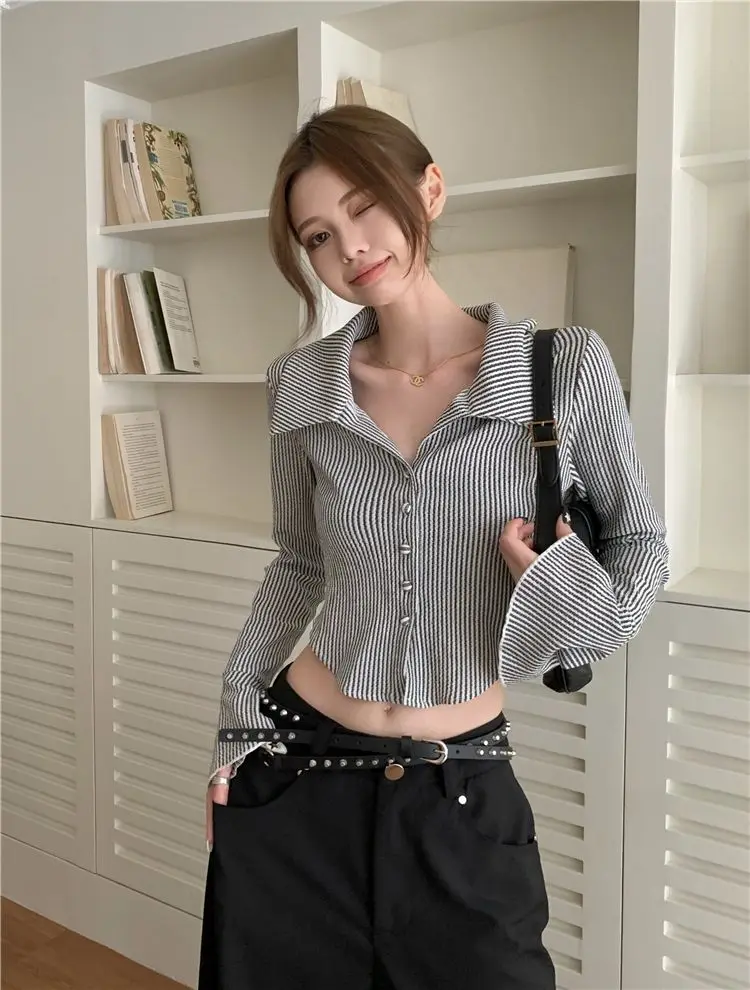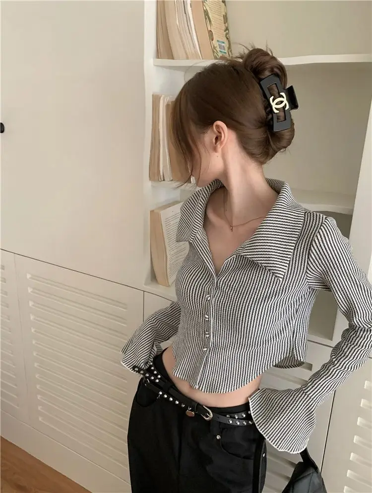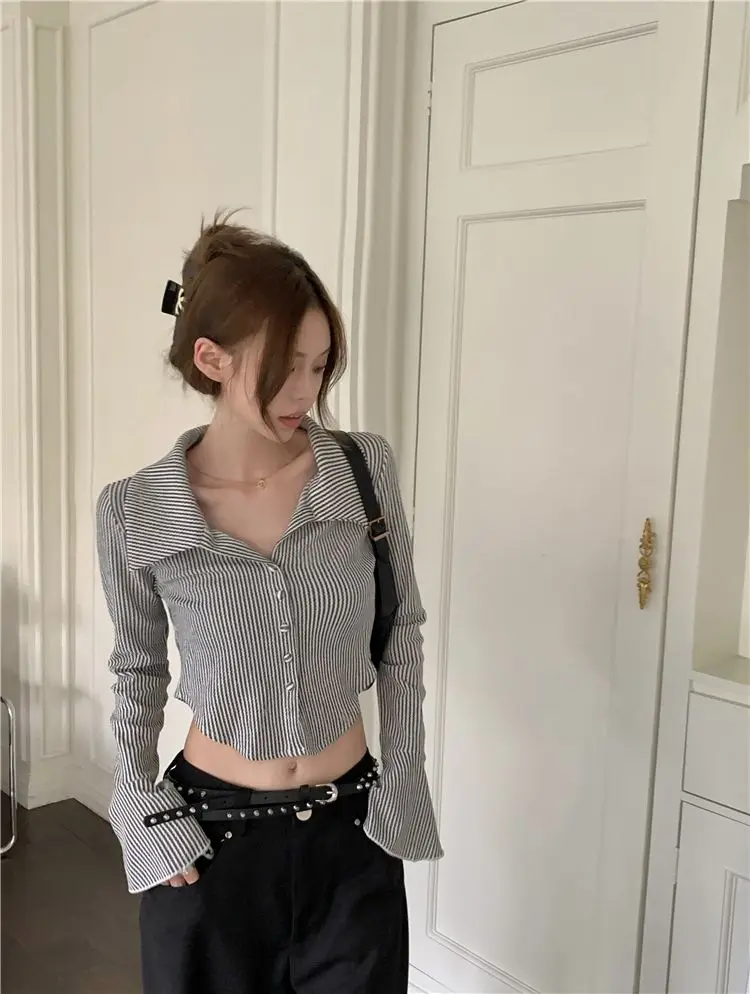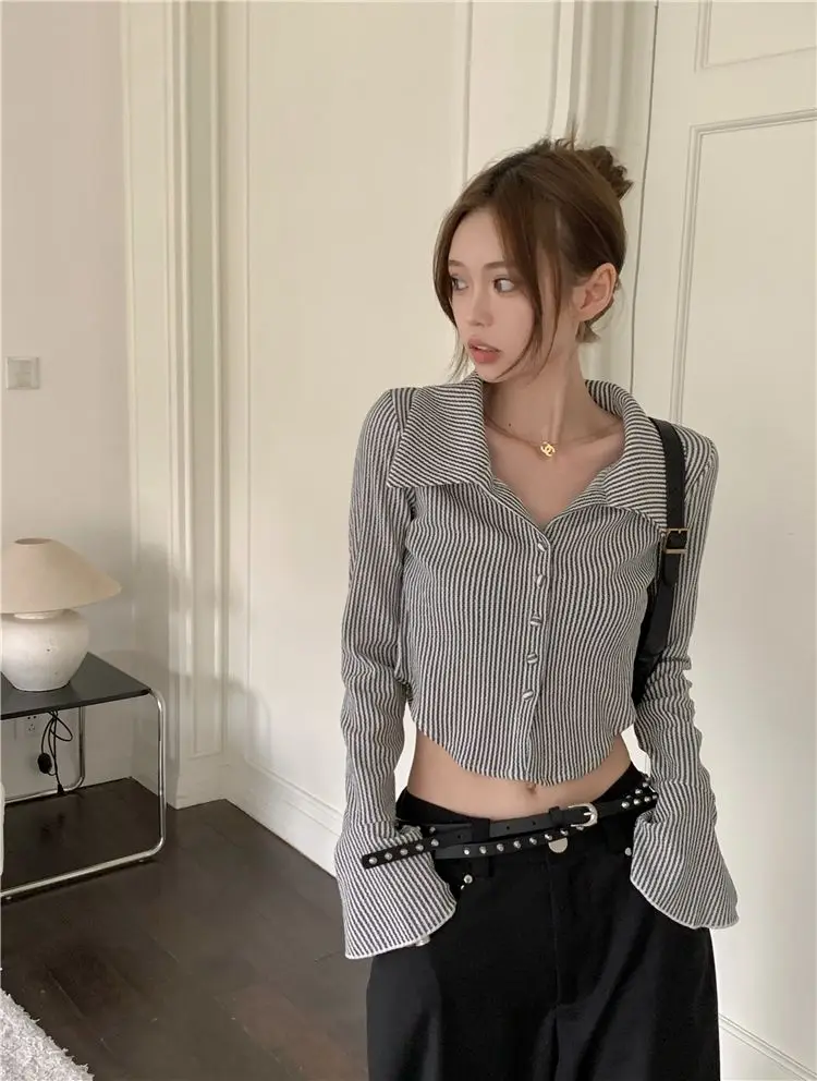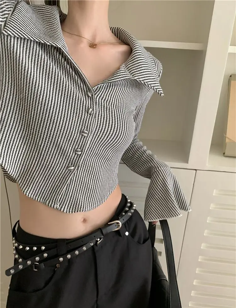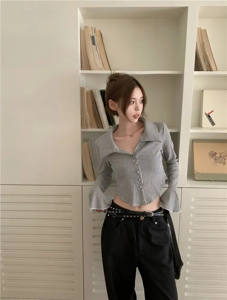 Lunivop Women Striped Cropped Vintage Shirts Korean Style Flare Sleeve Sexys Gyaru Chic Short Blouses Youthful Autumn Clothes