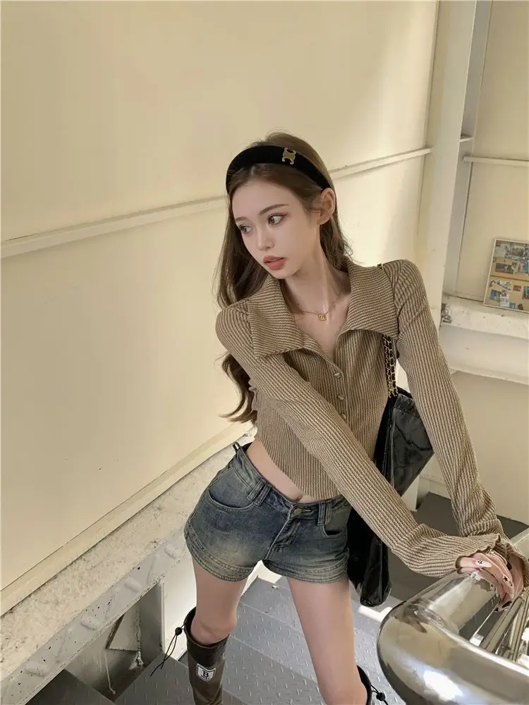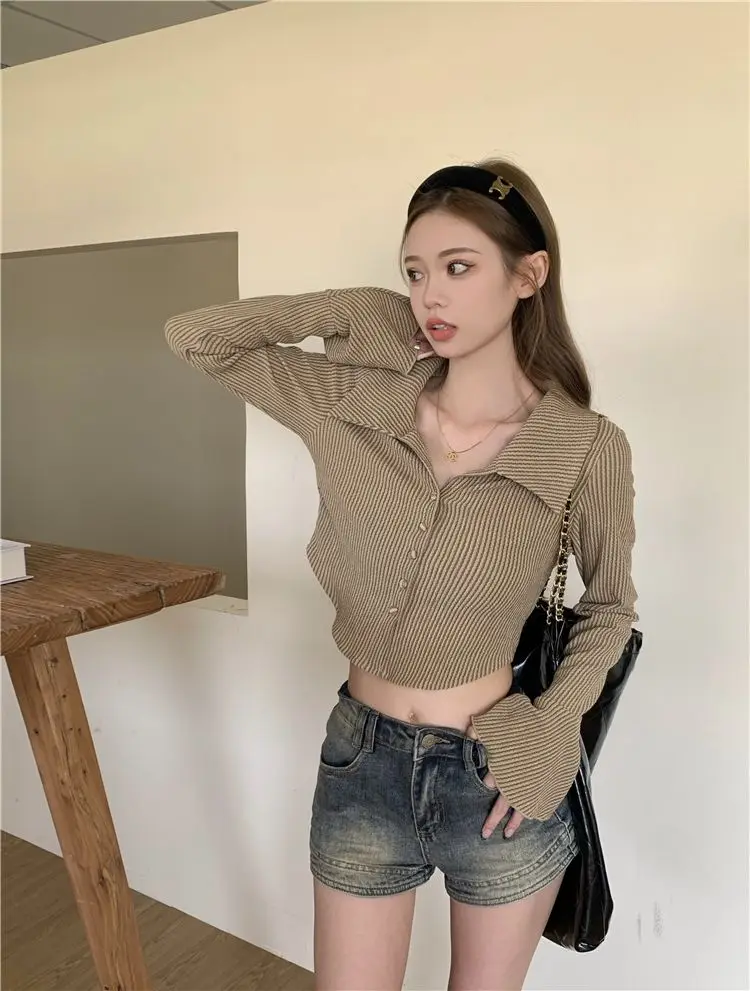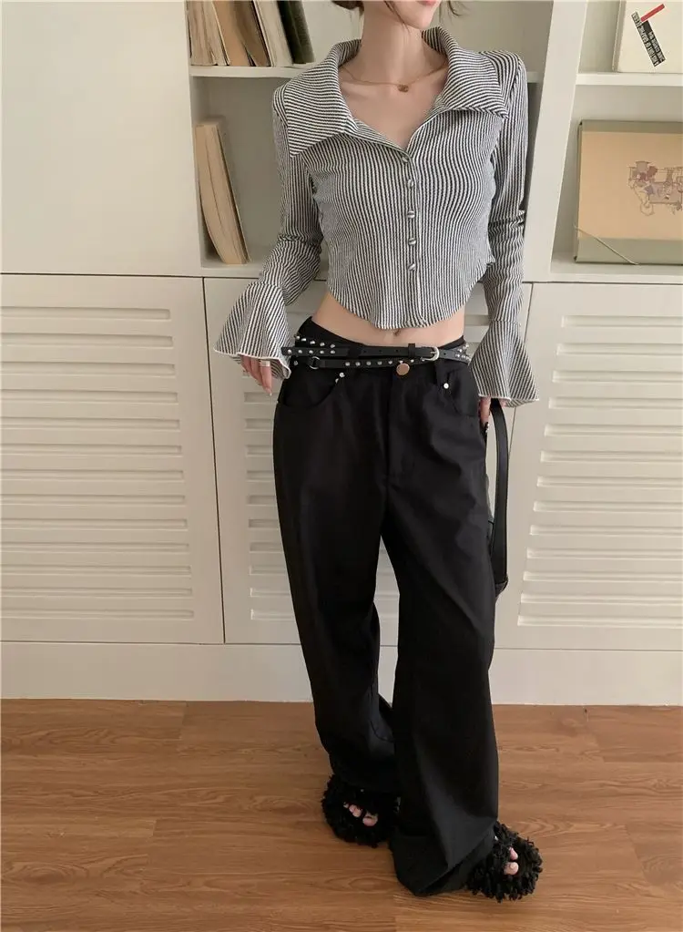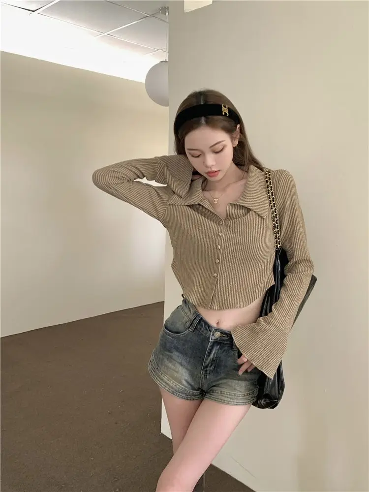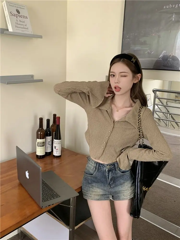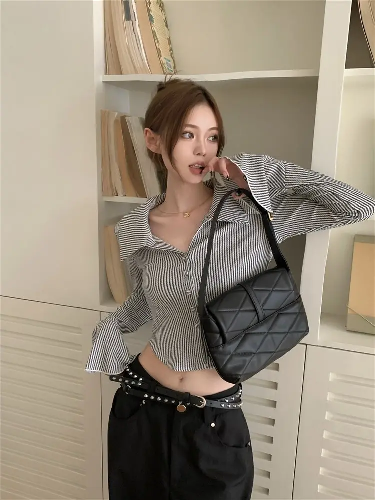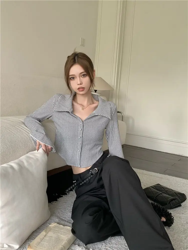 Lunivop Women Striped Cropped Vintage Shirts Korean Style Flare Sleeve Sexys Gyaru Chic Short Blouses Youthful Autumn Clothes