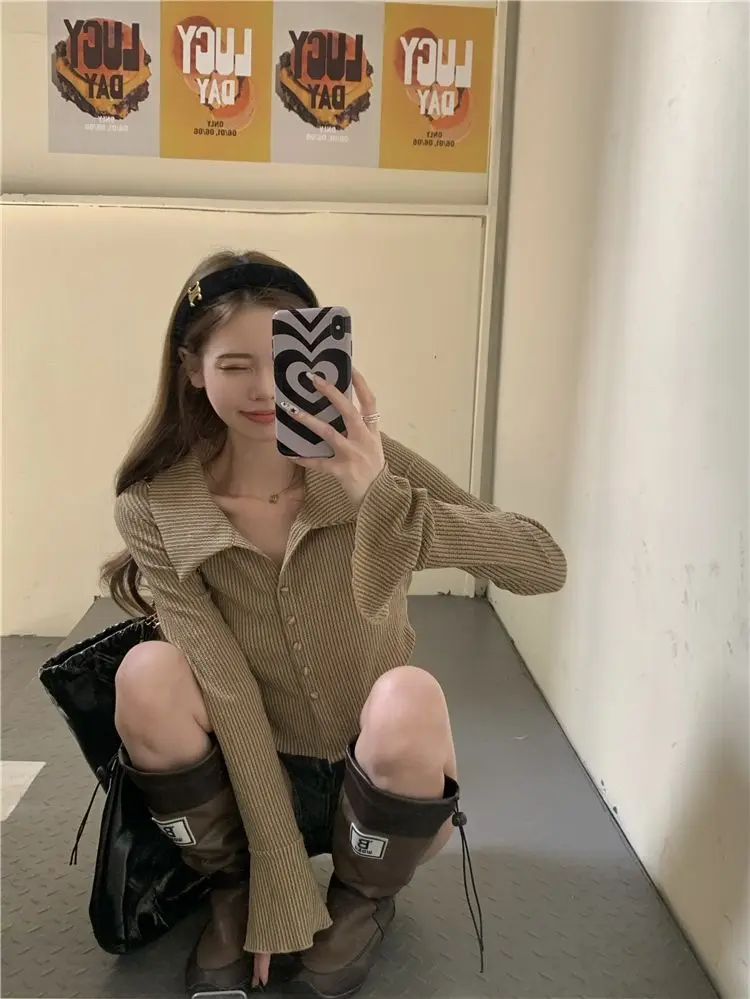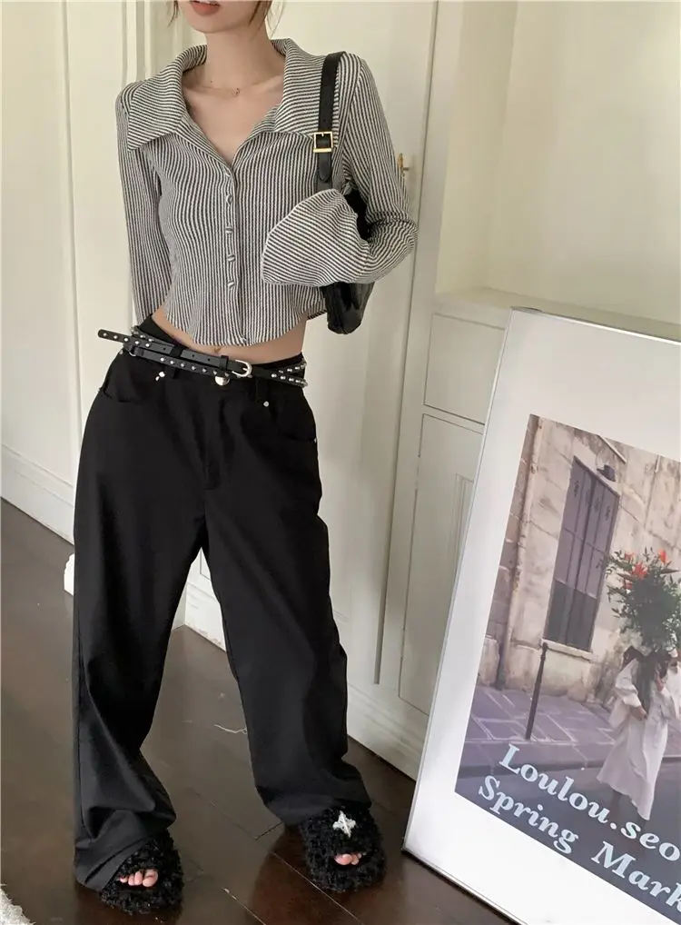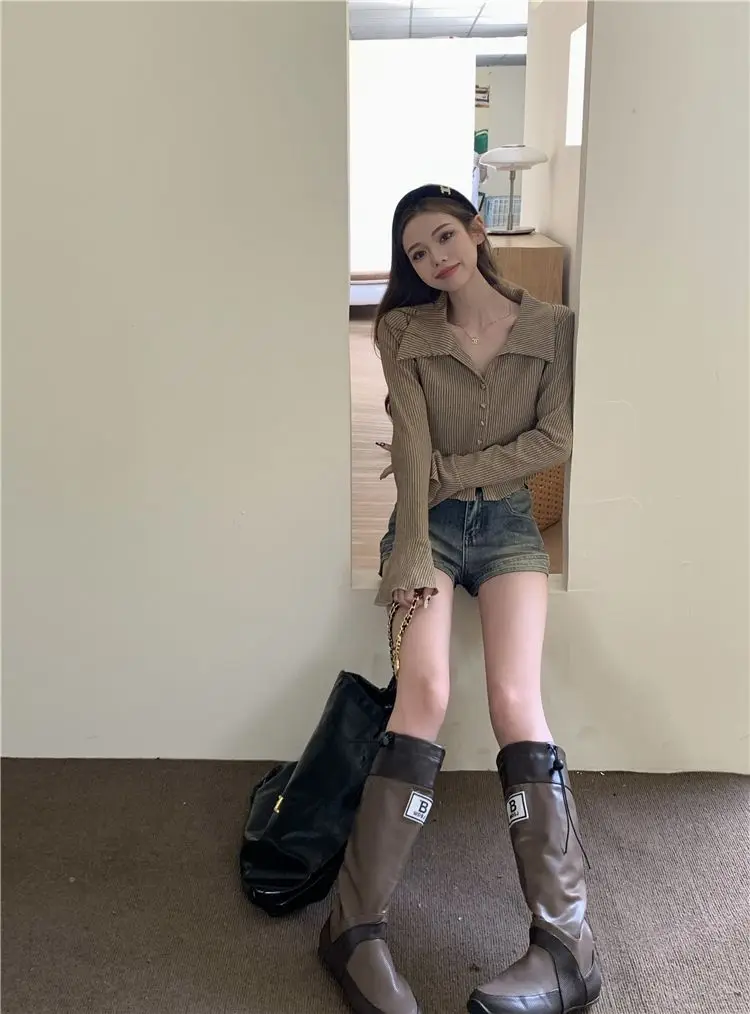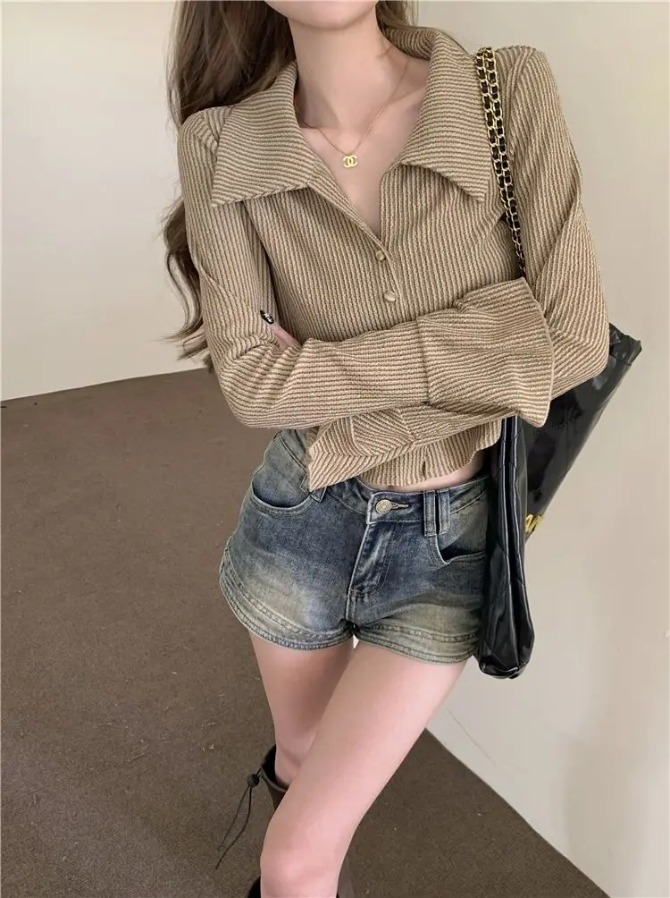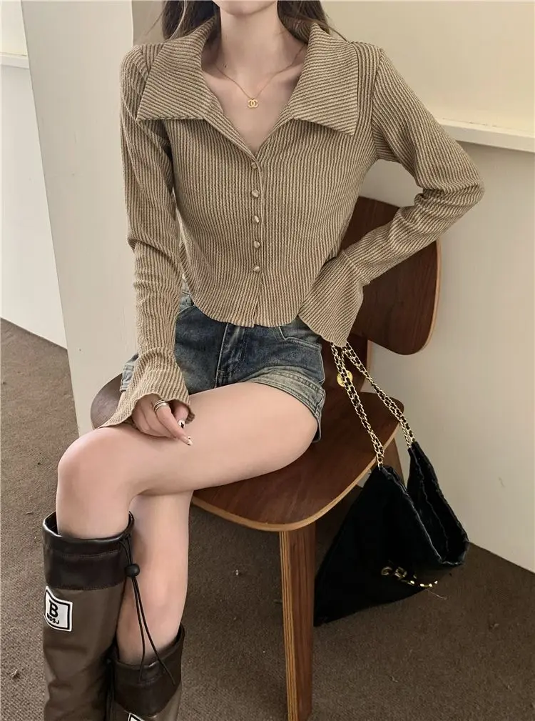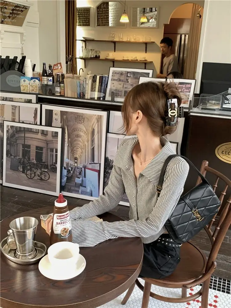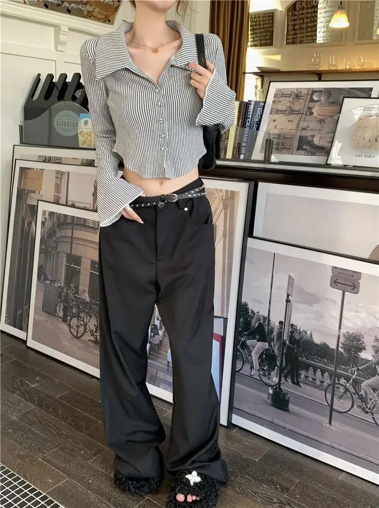 Lunivop Women Striped Cropped Vintage Shirts Korean Style Flare Sleeve Sexys Gyaru Chic Short Blouses Youthful Autumn Clothes