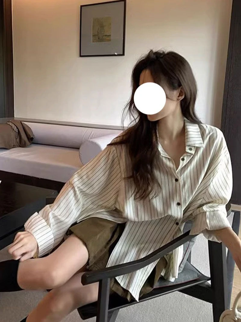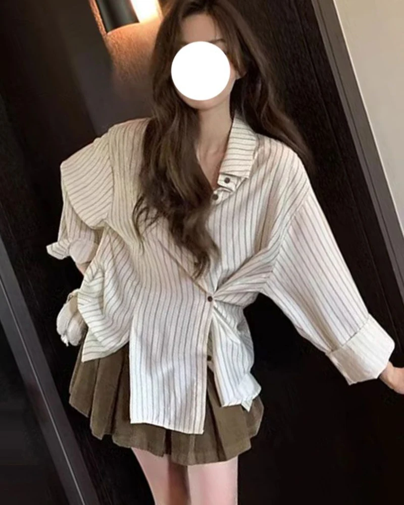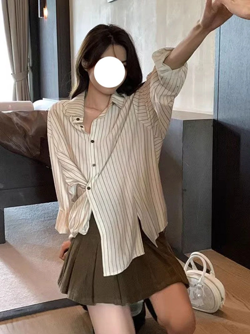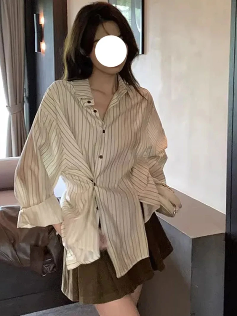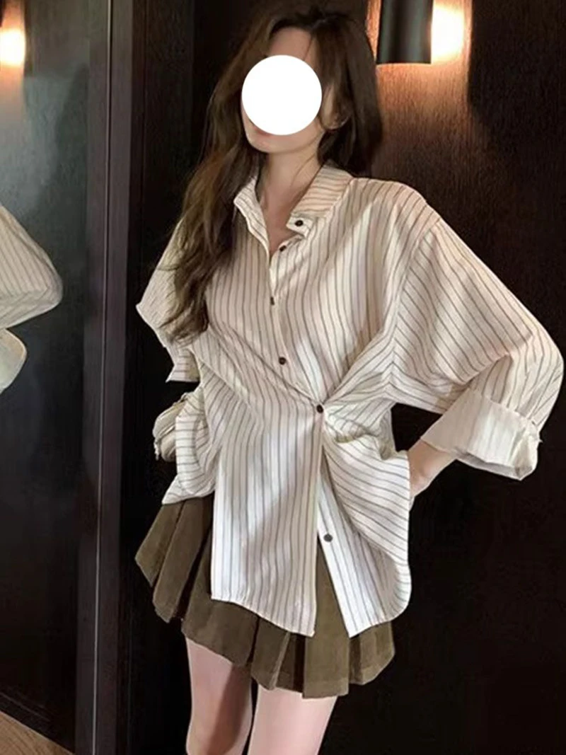 Lunivop Women Striped Shirt Korean High Street Casual Loose Long Sleeve Tops Summer Streetwear Irregular Turn Down Collar Ladies Blouse
