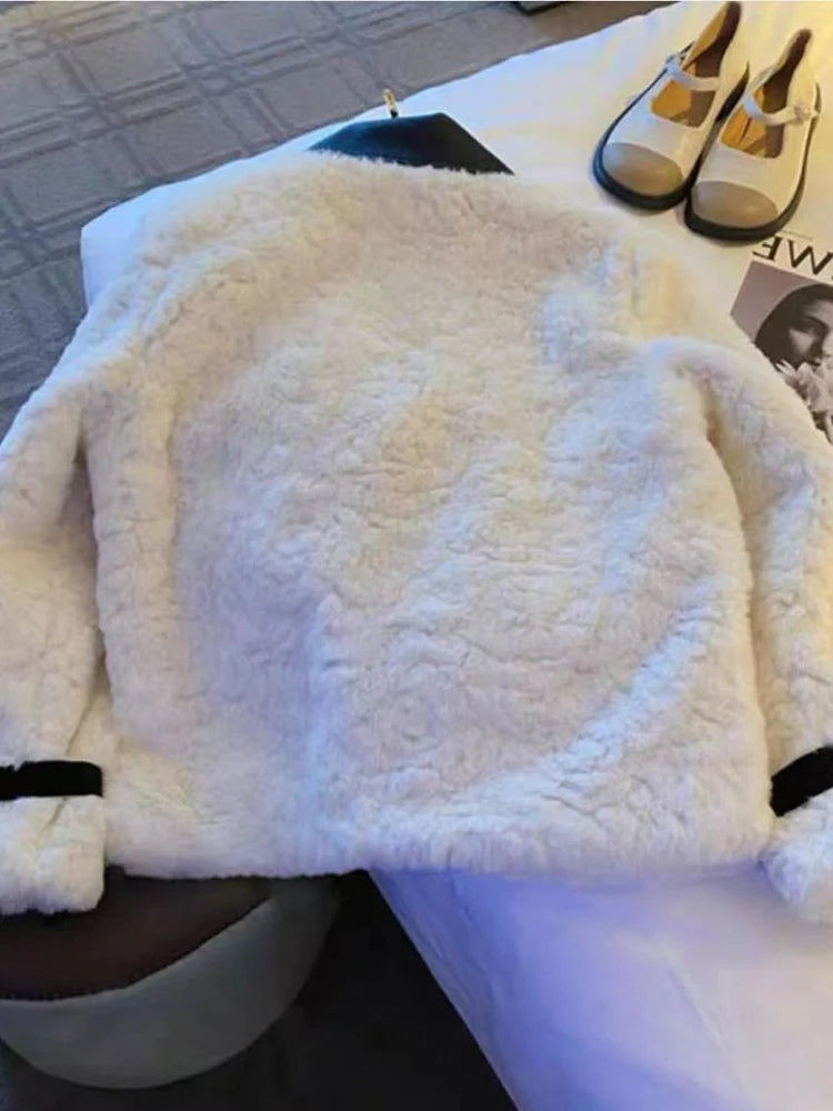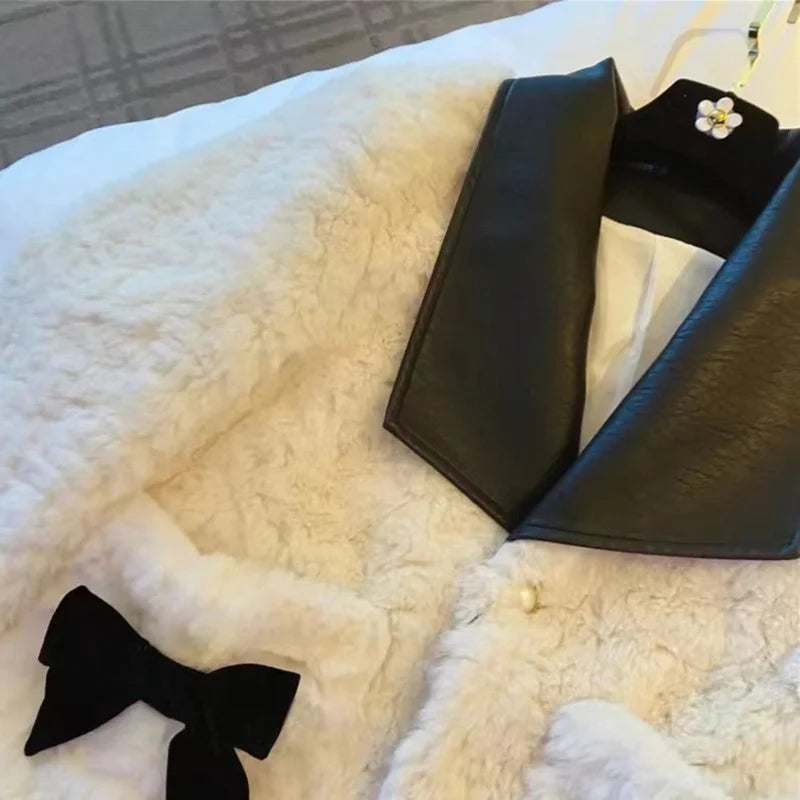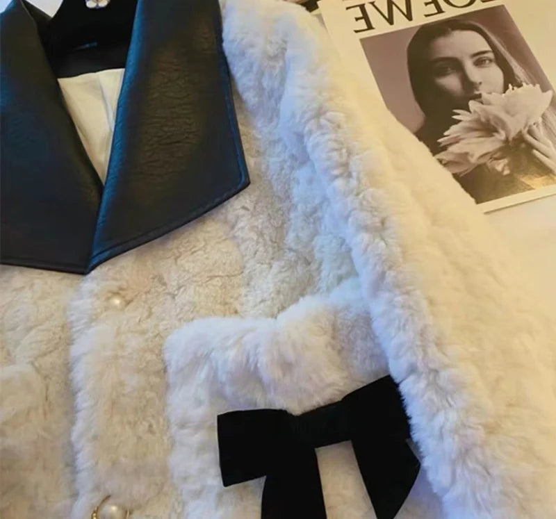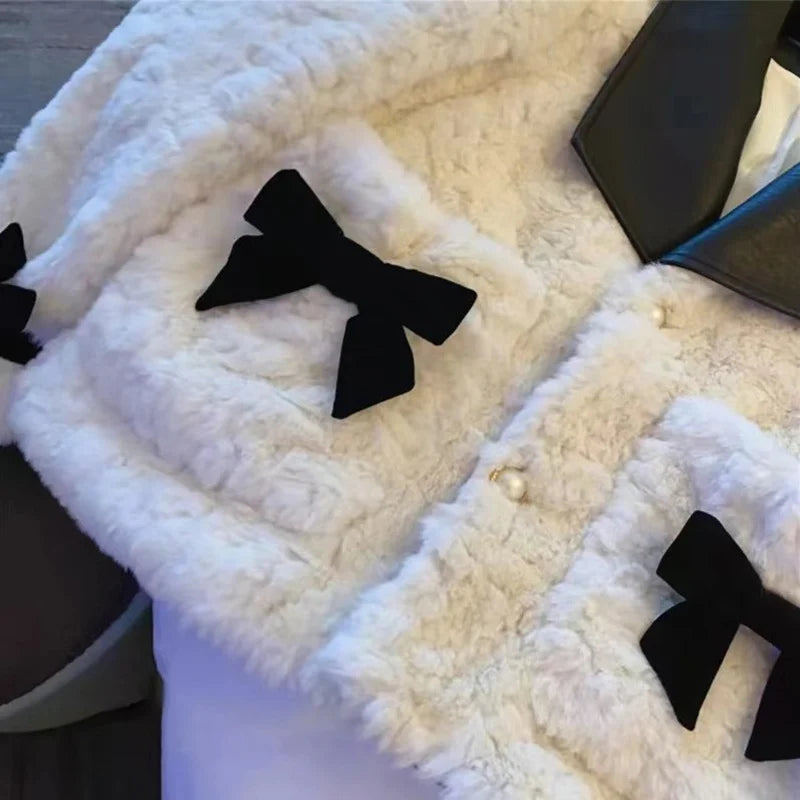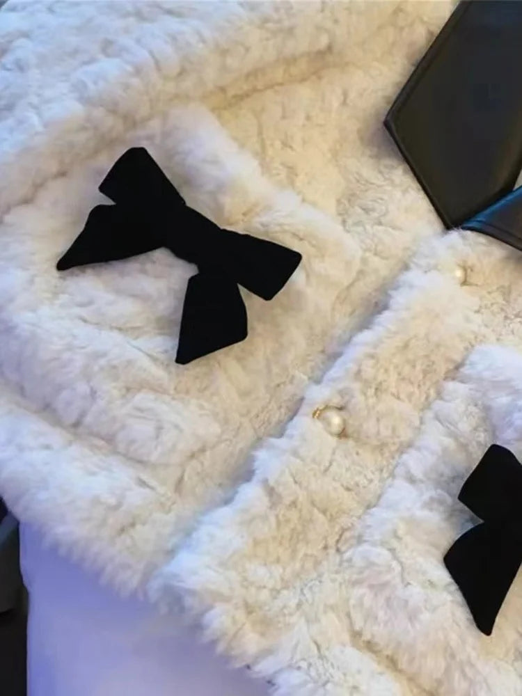 Lunivop Women Sweet Bow Faux Lamb Coat Fashion Korean Long Sleeve Winter Warm Jacket Chic Slim Patchwork Elegant Pockets Outwear