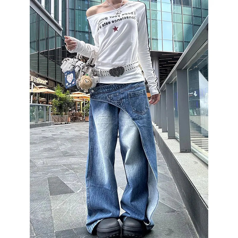 Lunivop Women's Casual Japanese Style Harajuku Jeans Vintage Aesthetic Mop Punk Loose Pants Y2K Wide Leg Baggy Washed Denim Trouser