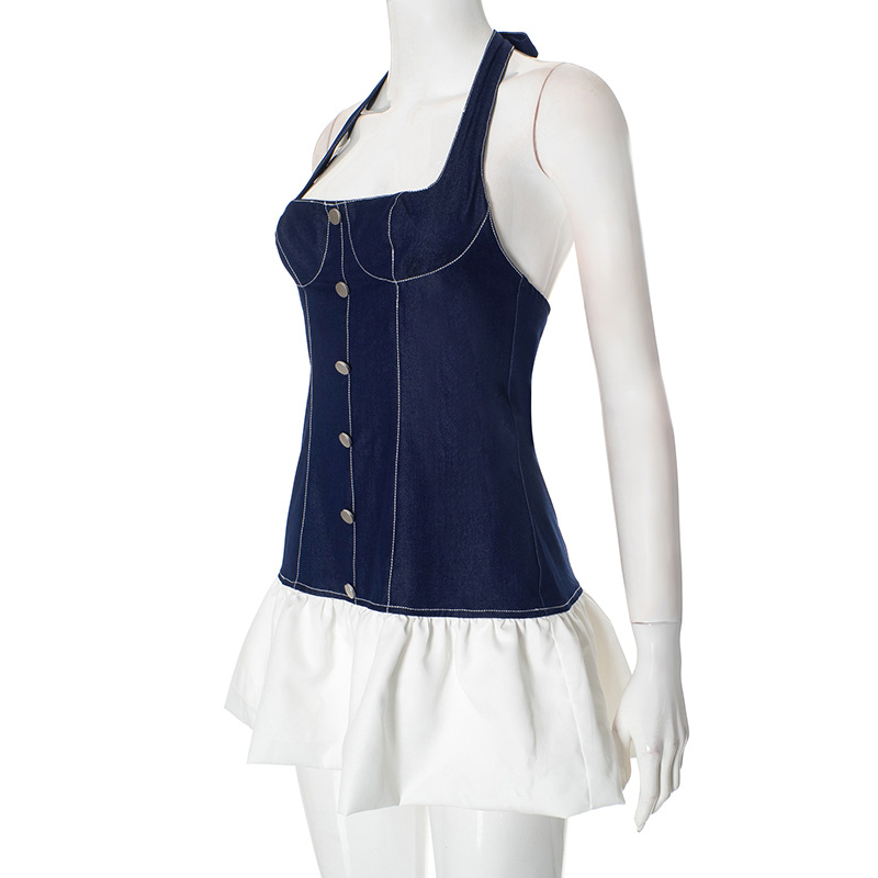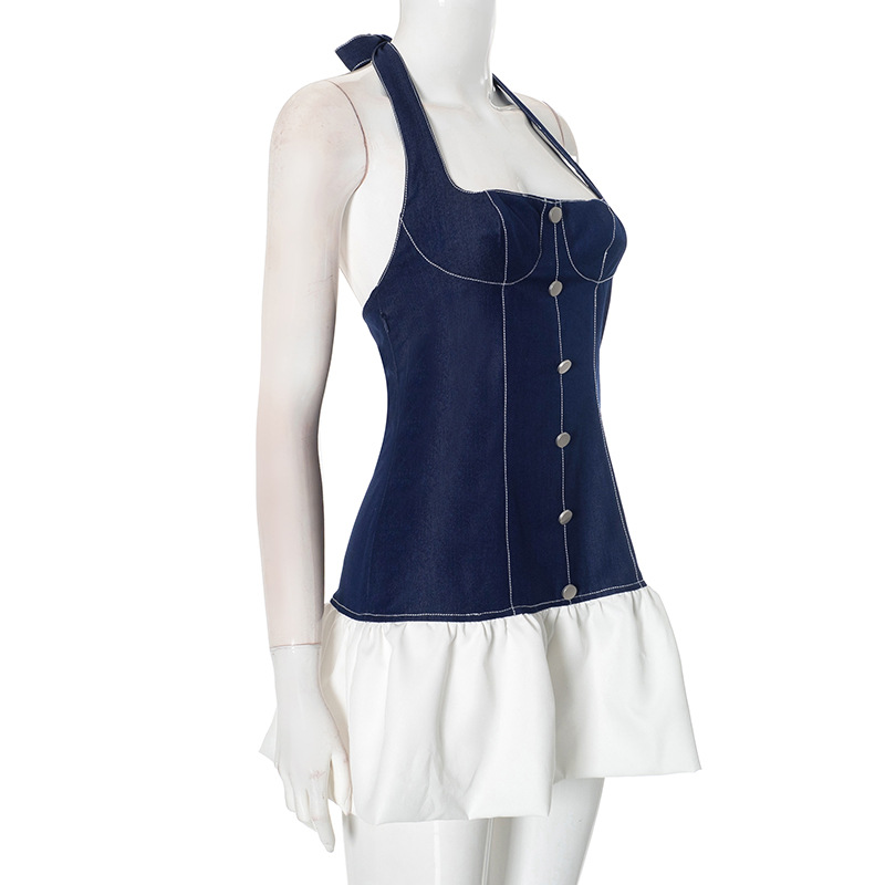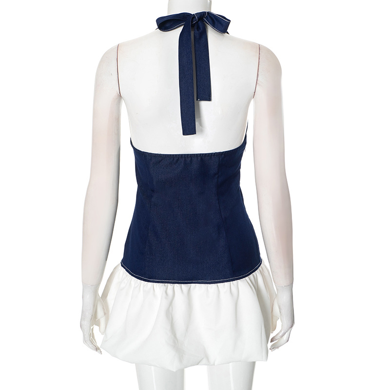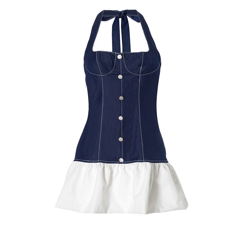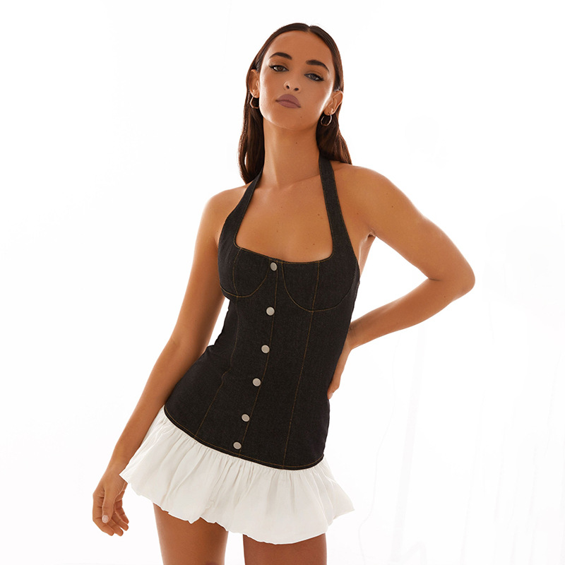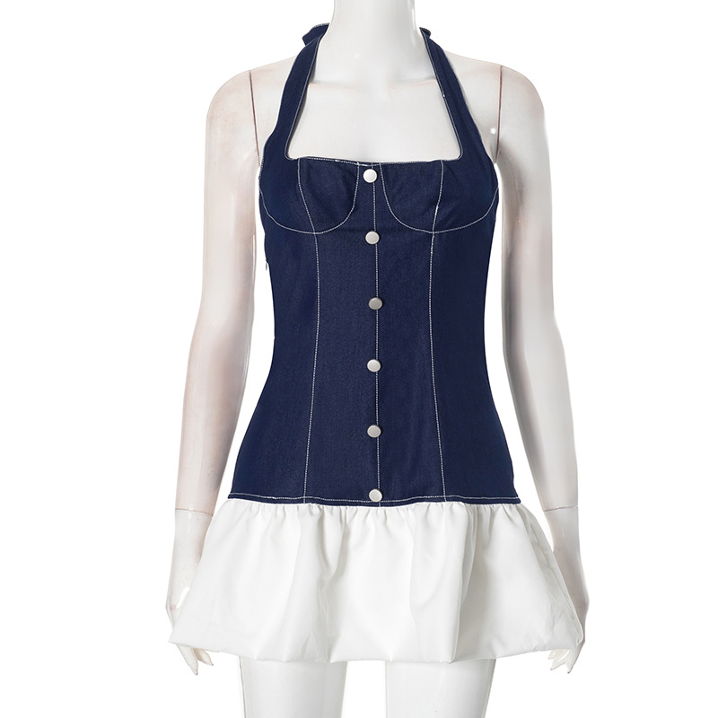 Lunivop Women's Clothing Spring Denim Splicing Halter Neck Strap Hot Girl Bubble Skirt Club Outfit