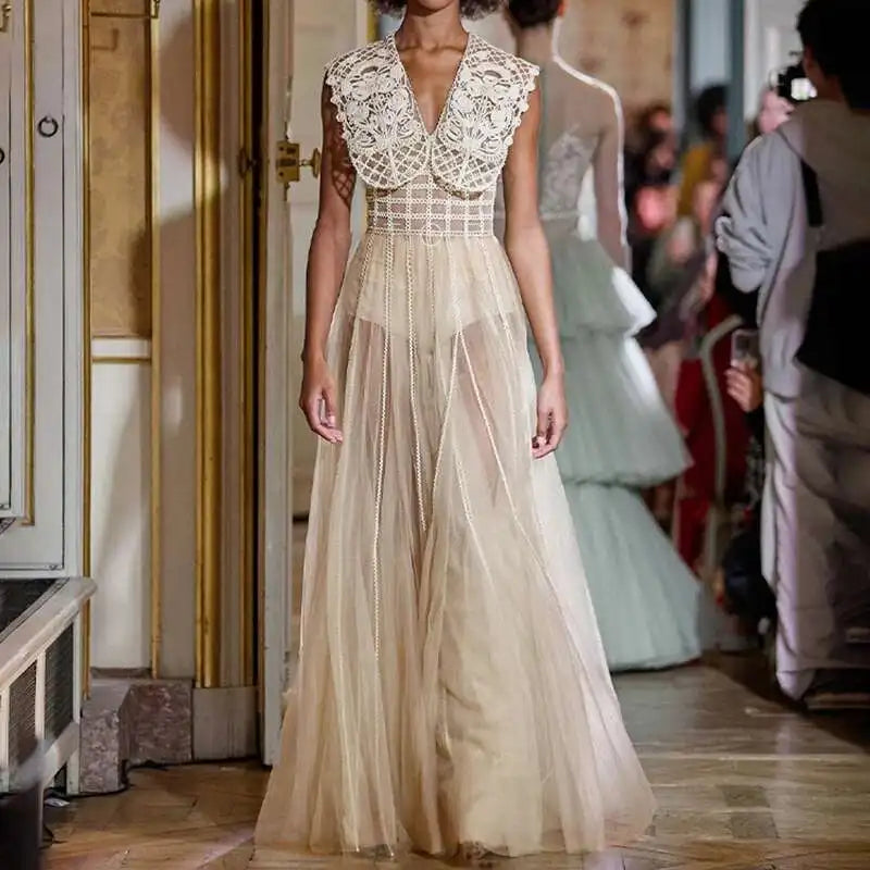 Lunivop Women's Fashion Evening Dress V-neck Sleeveless Lace Hollow Out Spliced Slim Mesh Dresses All Season New Tide
