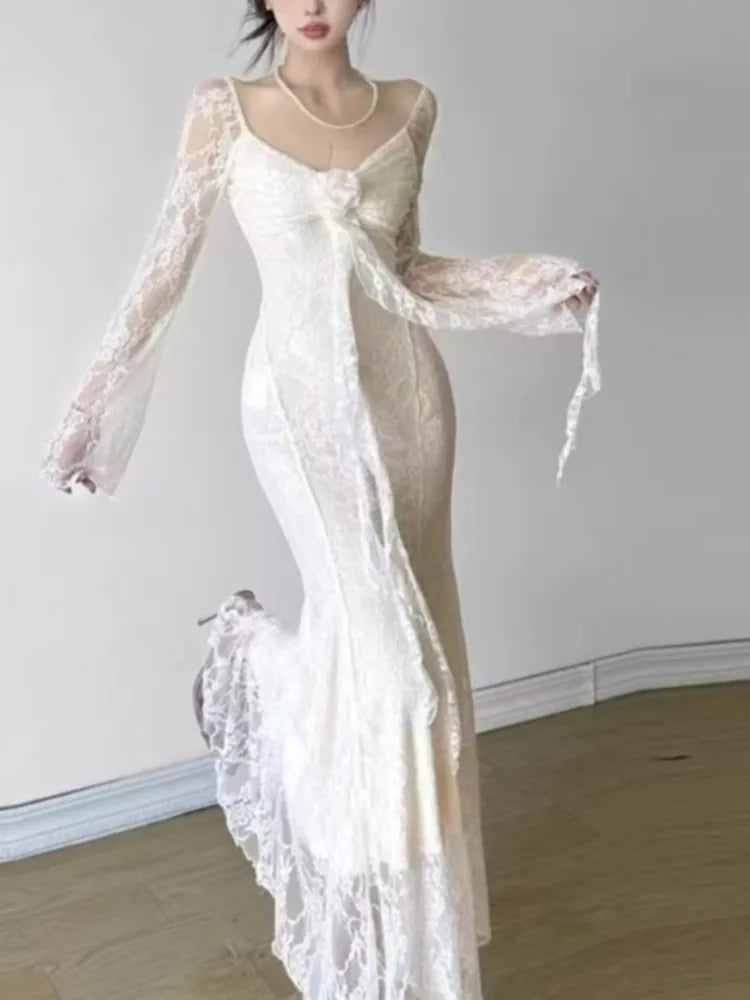 Lunivop Women's Floral Ruffles Sexy Slim Dresses French Vintage Women White Lace Long Sleeved Dress Summer Holiday A-line Vestidos New