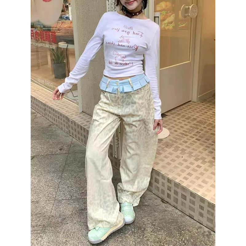 Lunivop Women's Retro Wide Leg Baggy Casual Denim Trouser Harajuku Aesthetic High Waist Loose Jeans Autumn Spliced Leopard Print Pants