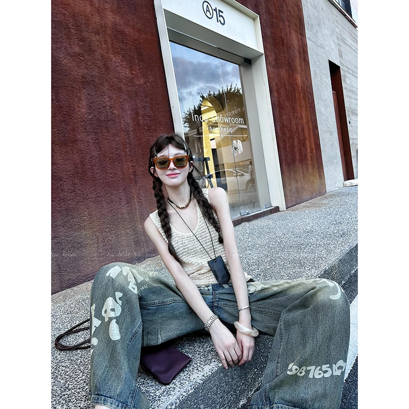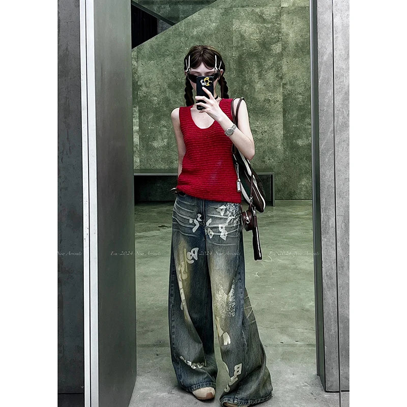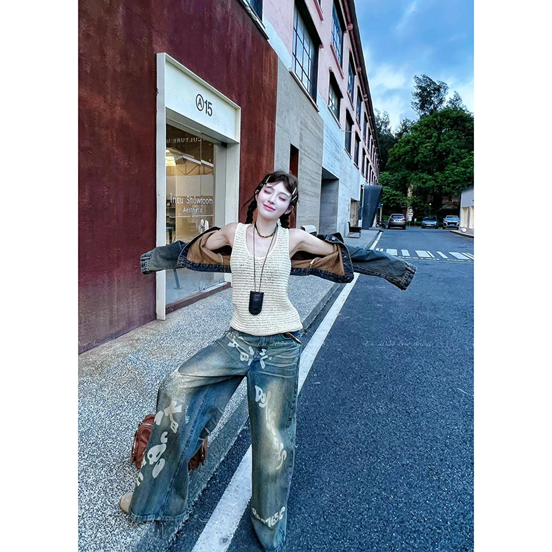 Lunivop Women's Retro Wide Leg Baggy Casual Printting Denim Trouser Harajuku Vintage High Waist Loose Jeans 2024 Winter Fashion Pants