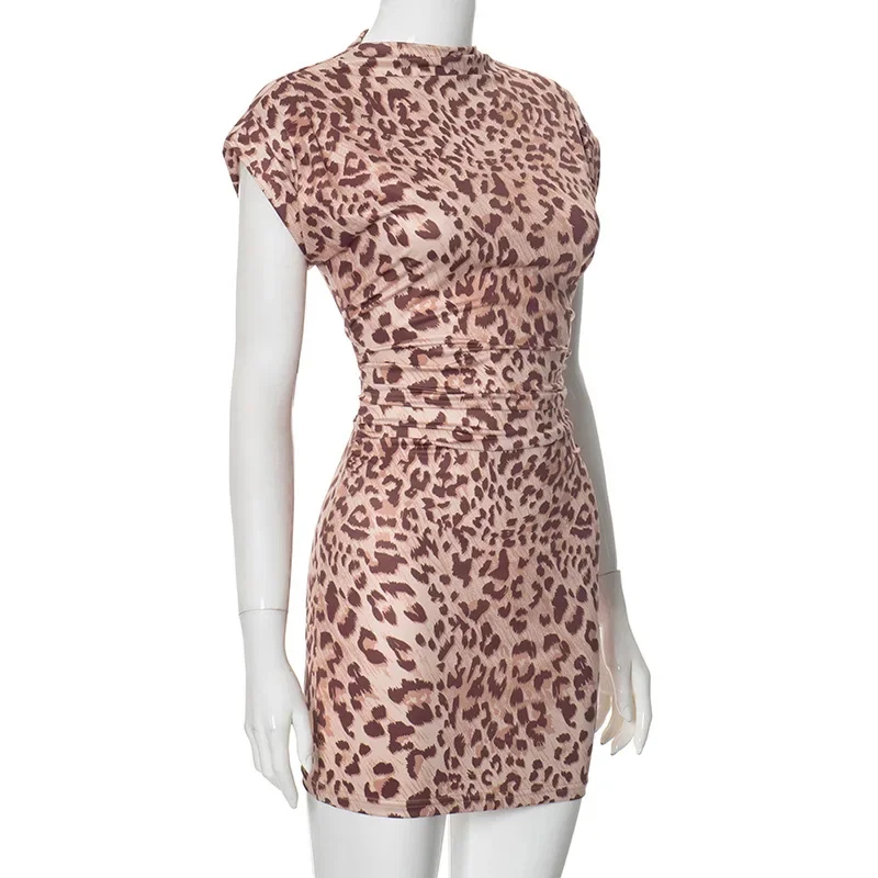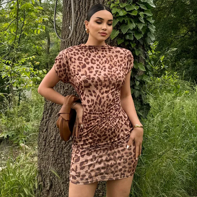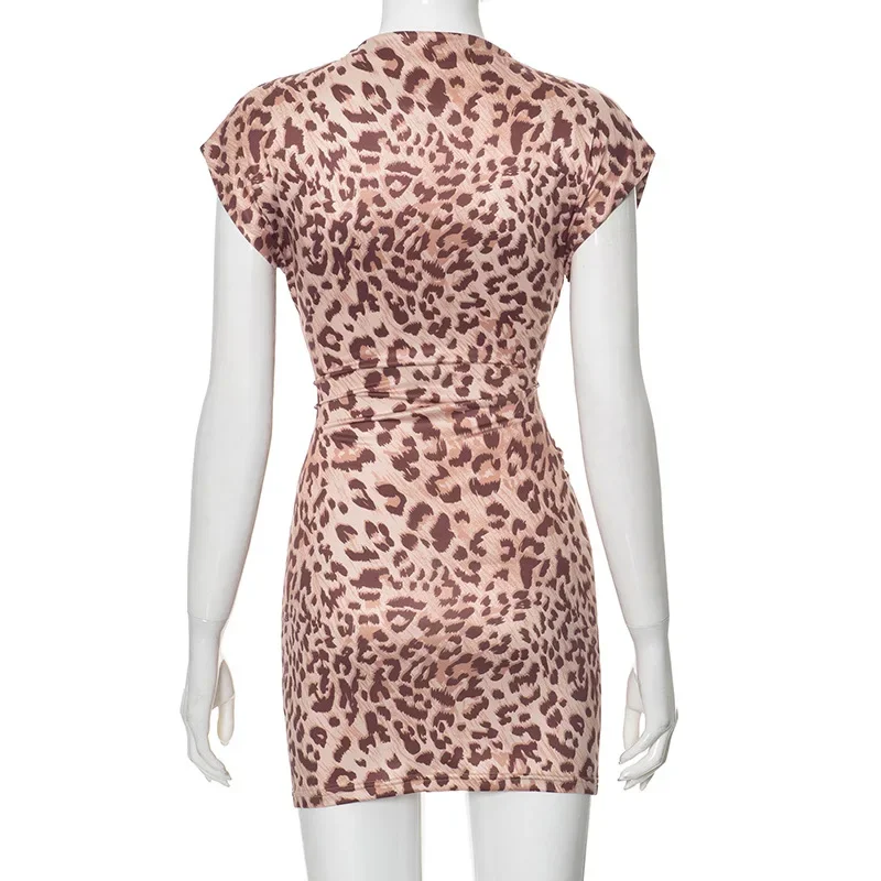 Lunivop Women's sexy leopard print round neck sleeveless hip wrap short dress women's summer new