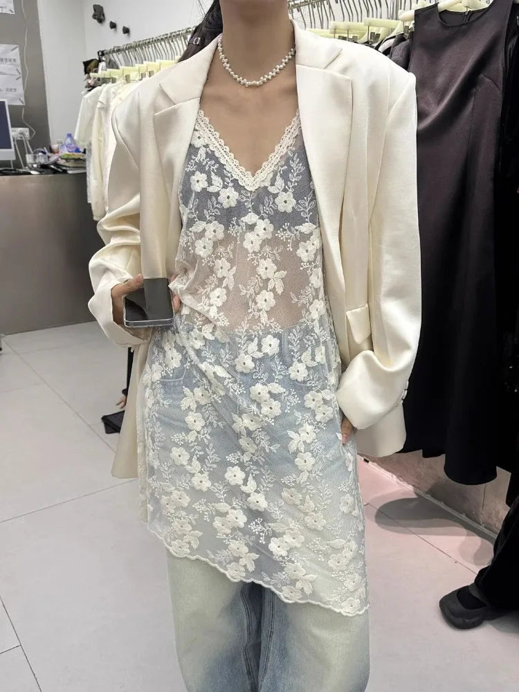 Lunivop Y2k All-match Lace V-neck Vest Dress for Women See Through Mesh Dresses 2025 Summer New Sleeveless Thin Vestidos De Mujer