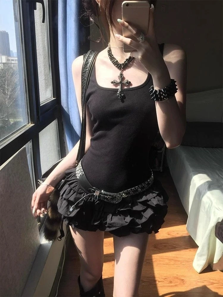 Lunivop Y2k Black Square Neck Sexy Dress for Women Summer Slim Waist Ruched Cake Dresses 2025 New Sleeveless Vestidos De Mujer