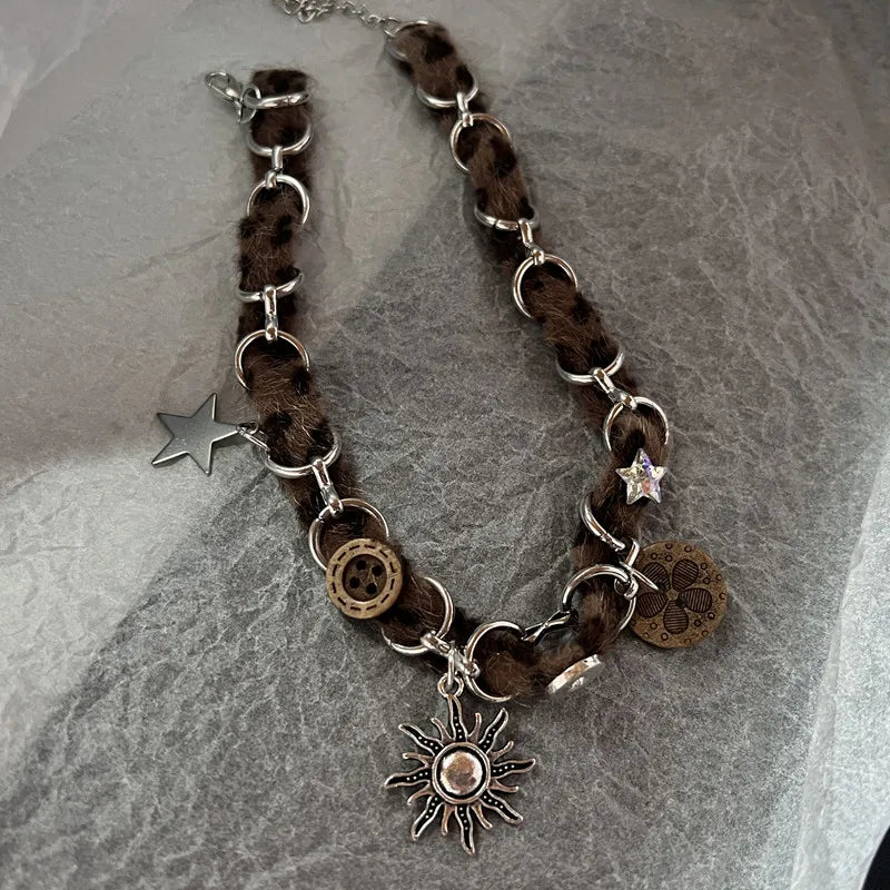 Lunivop Y2K Brown Opal Sun Pendant Necklace for Men Women Hip Hop Crystal Cross Leather Patchwork Necklace Grunge Party Jewelry