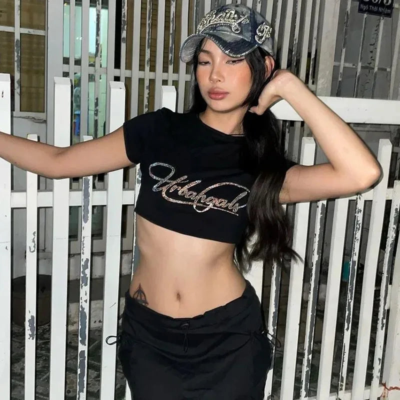Lunivop Y2k Clothes Vintage Cartoon Rhinestones Aesthetic WomenTops Fairy Grunge Graphic T Shirts Slim Super Short Style Top