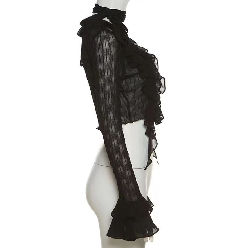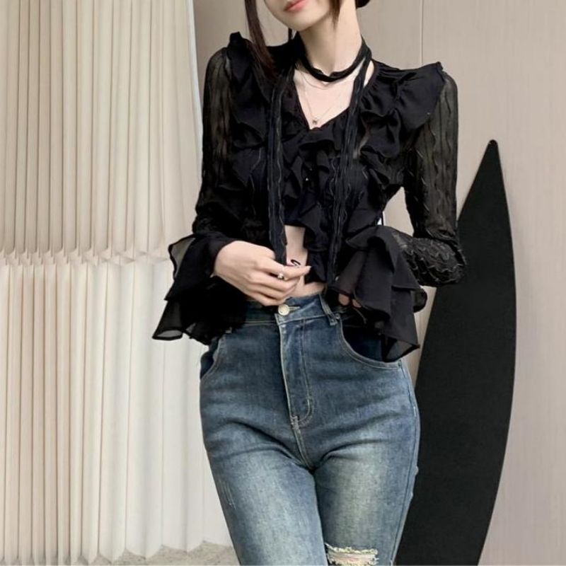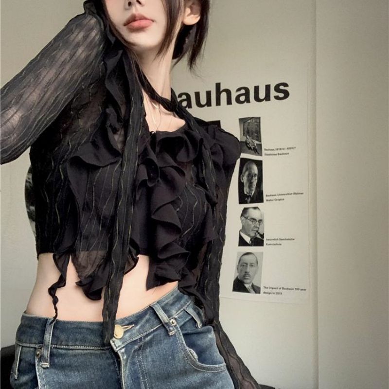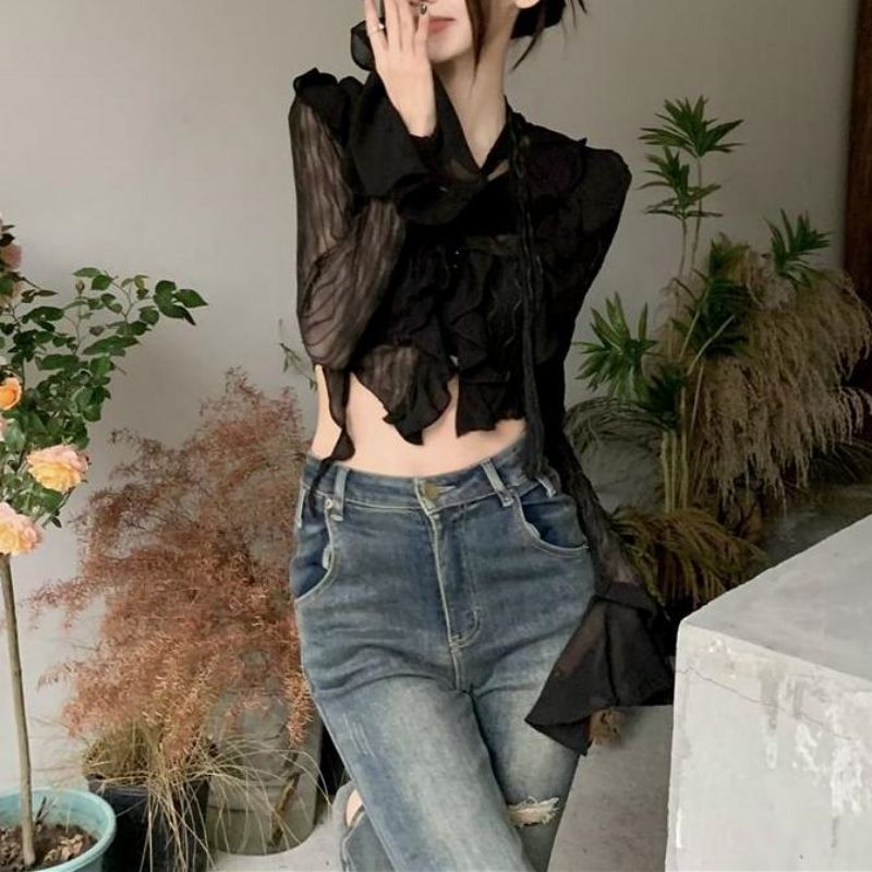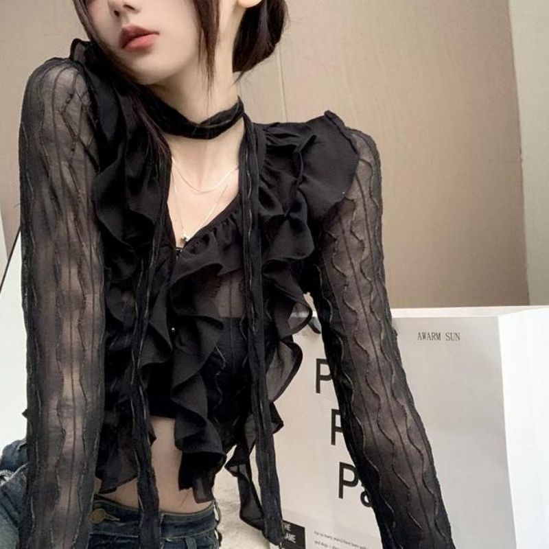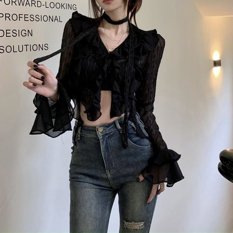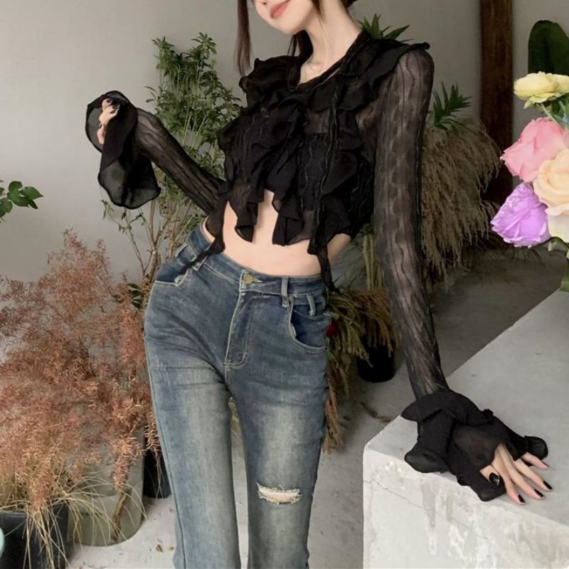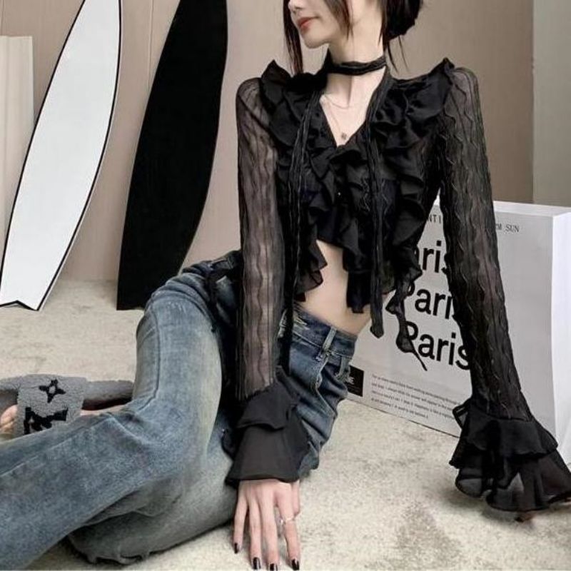 Lunivop Y2k Crop Top Women Lace Blouses Sexy Gothic GrungeFemale Shirts Elegant Black Transparent Cardigan Korean Streetwear