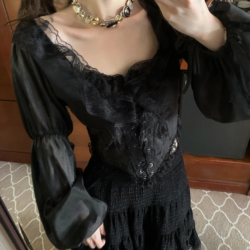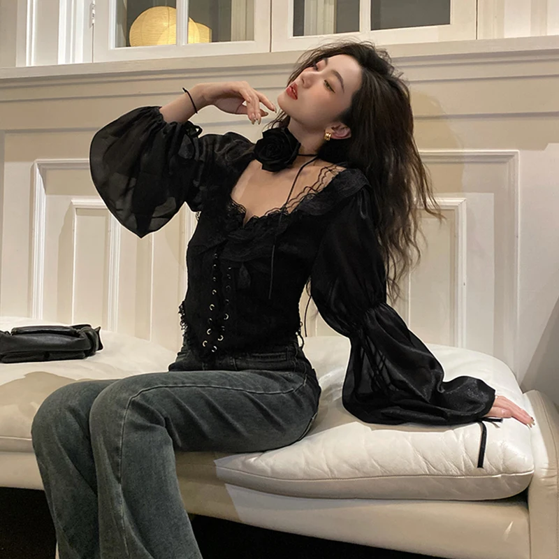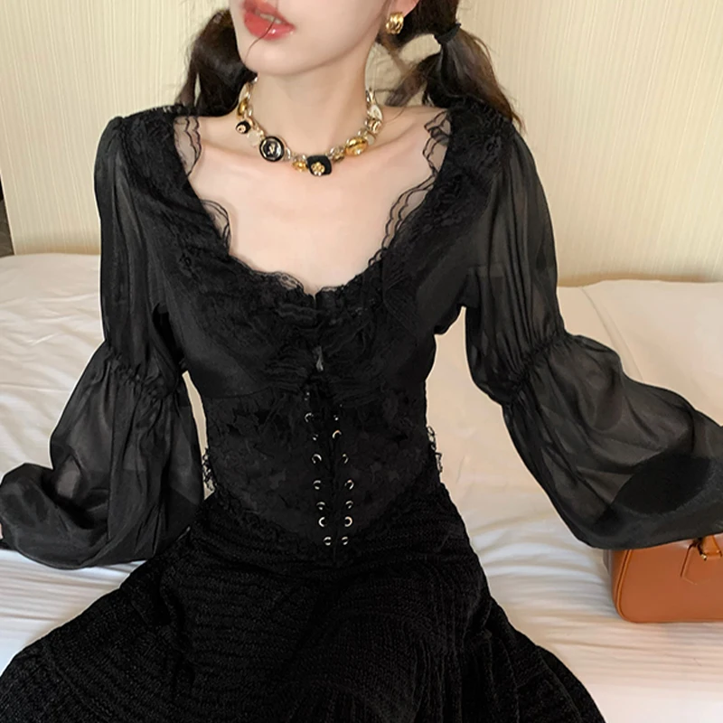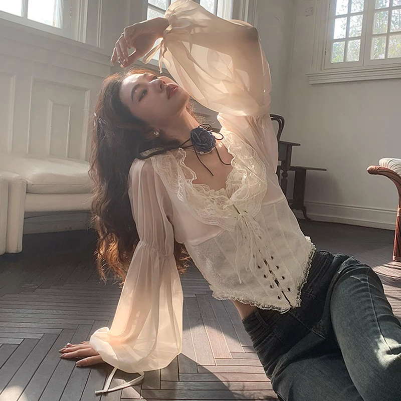 Lunivop Y2K Fairy Women Lace Ruffles Chiffon Blouses Cross Tie-Up Front Lantern Sleeve Shirts Fashion Spring Casual Crop Tops