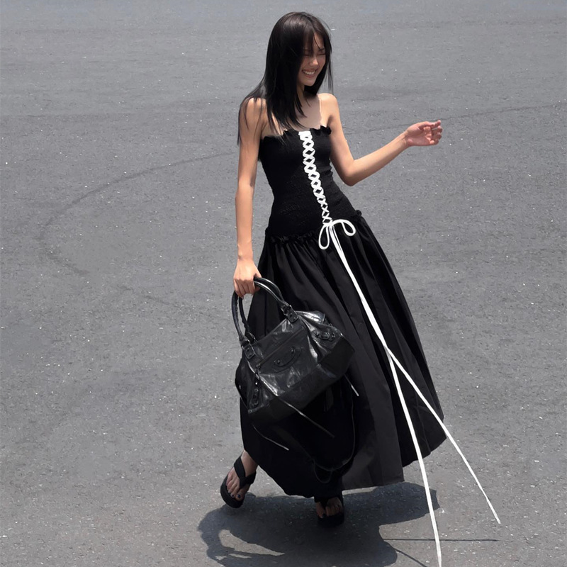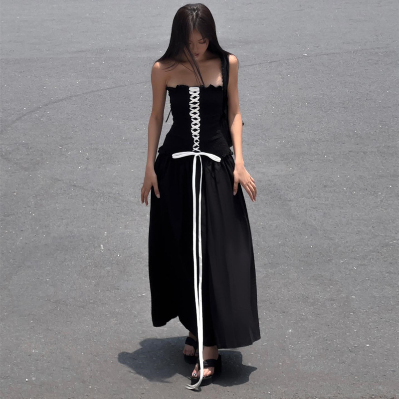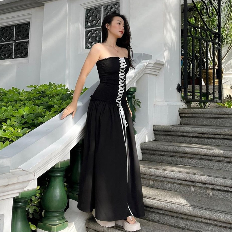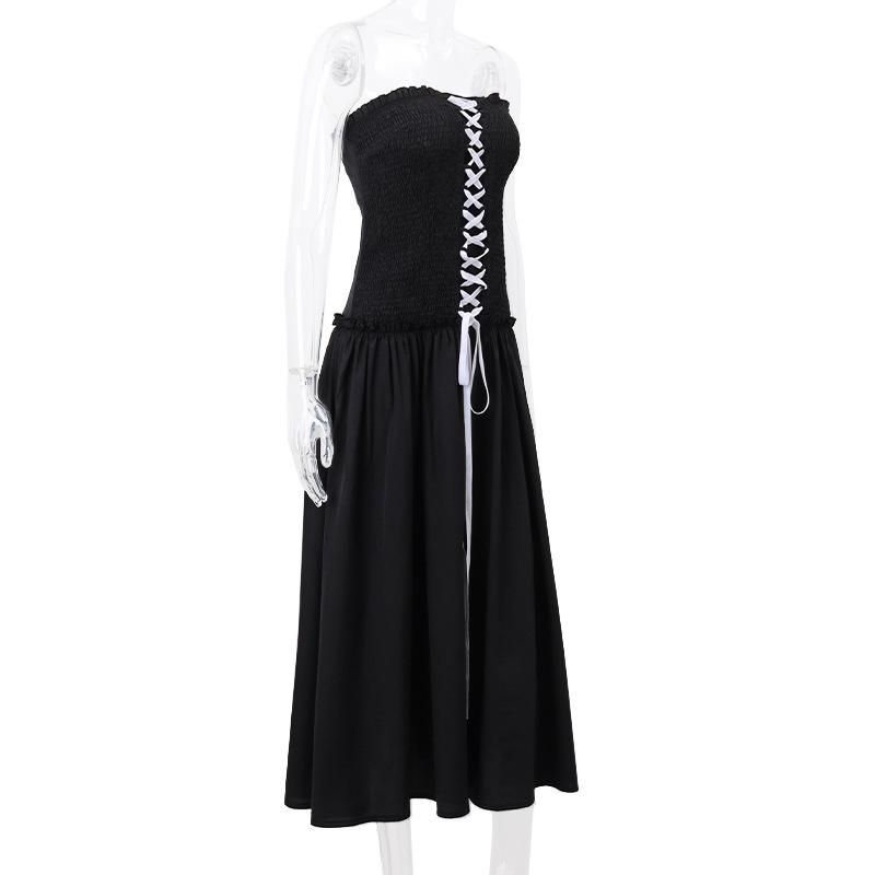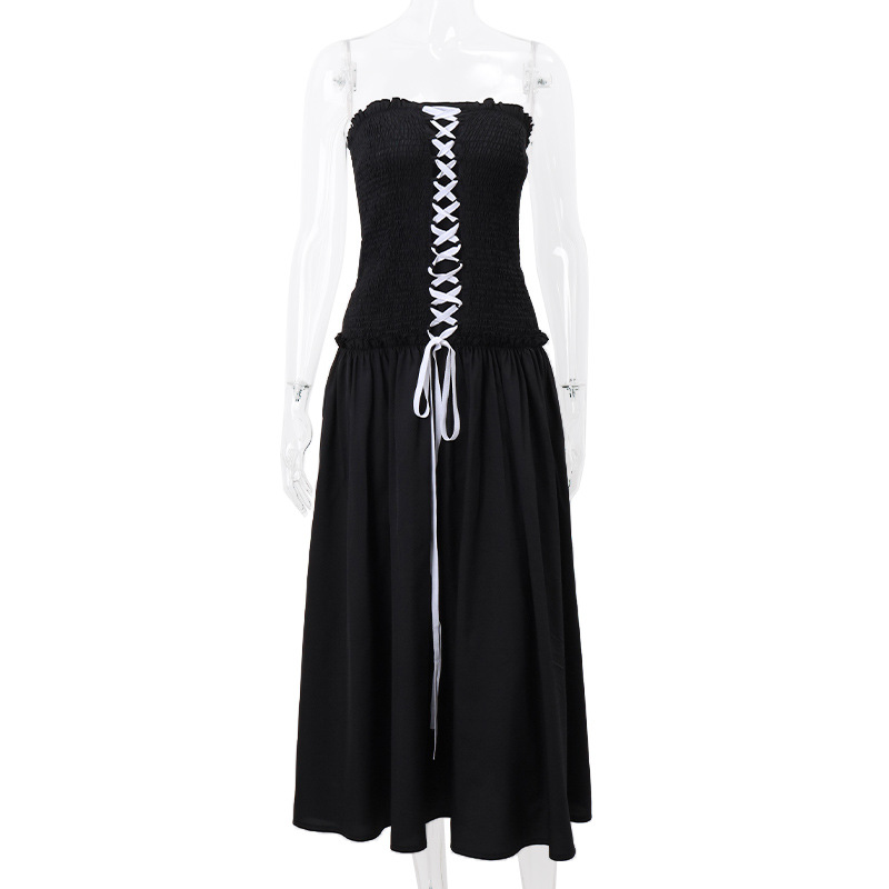 Lunivop Y2K Fairy Women Summer Long Dress VIntage Ruched Front Cross Tie-Up Boat Neck Strapless Tube Dress Summer Backless Party Dress