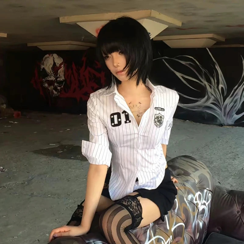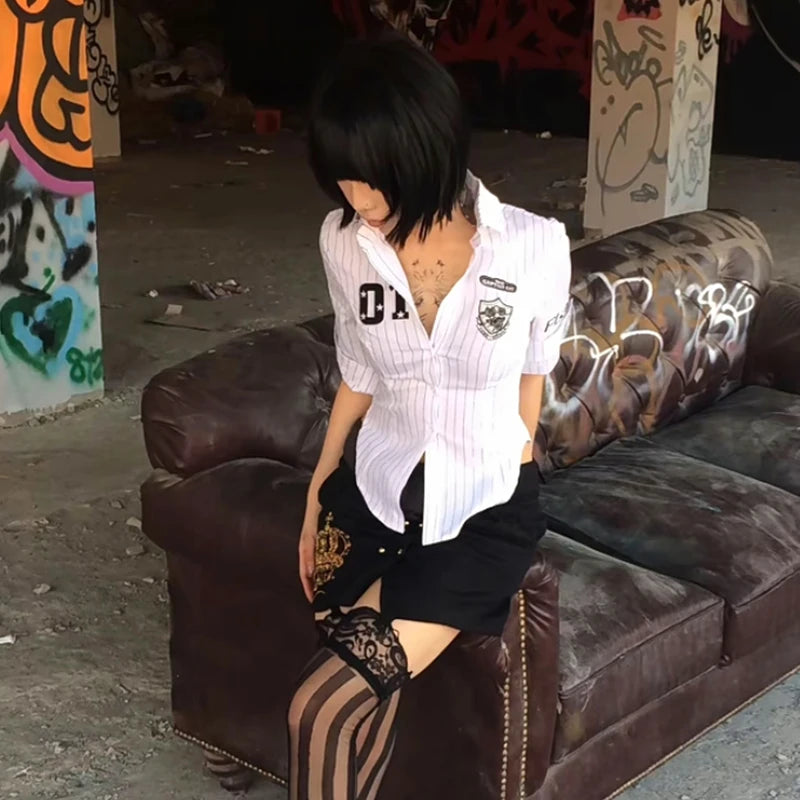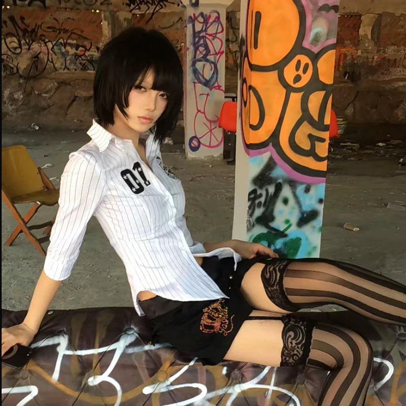 Lunivop Y2k Japanese Striped Shirt Women Three Quarter Print Graphic Tops 2000s Aesthetic Tops Japanese Summer Crop Tops Grunge