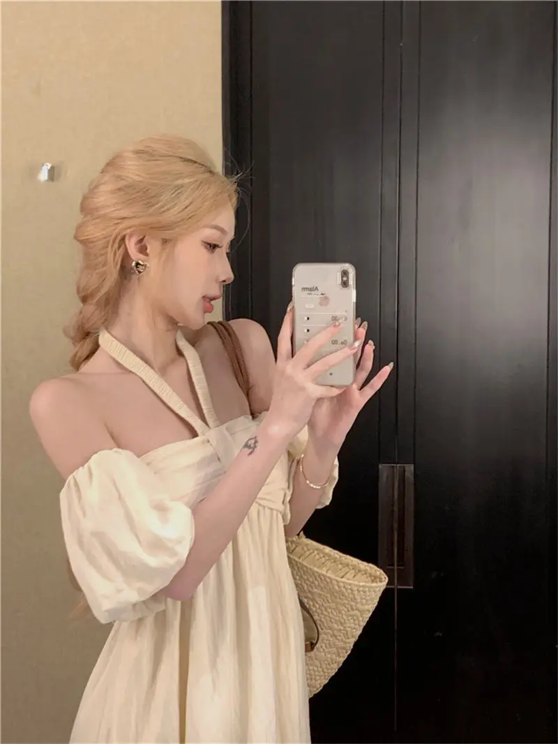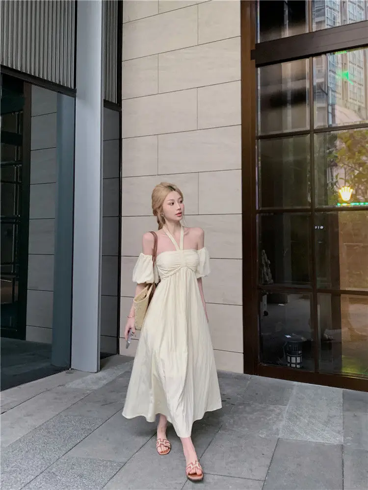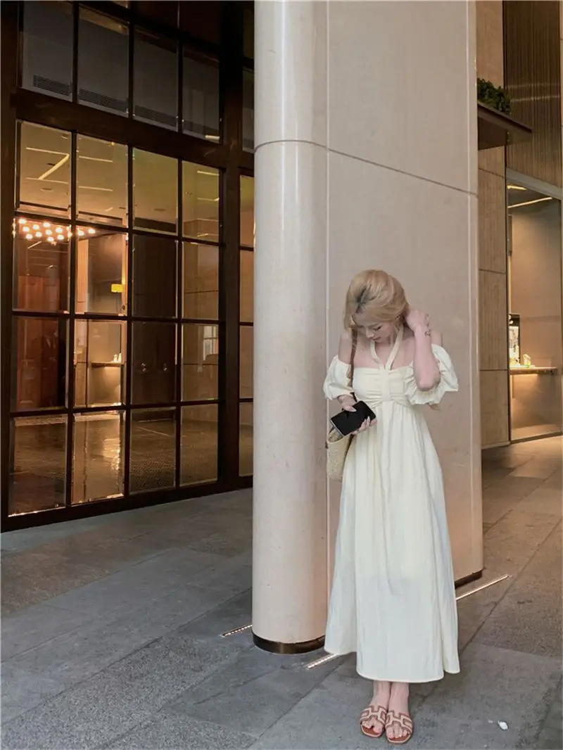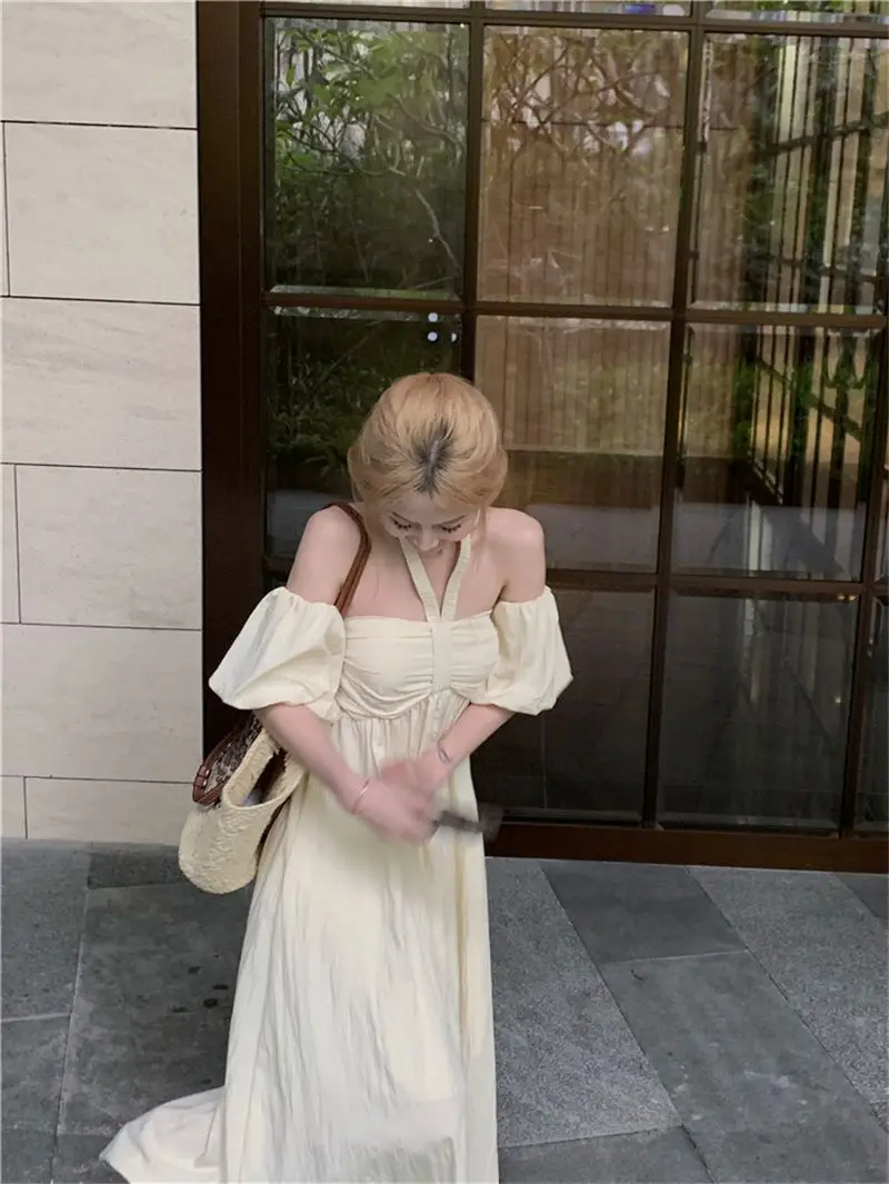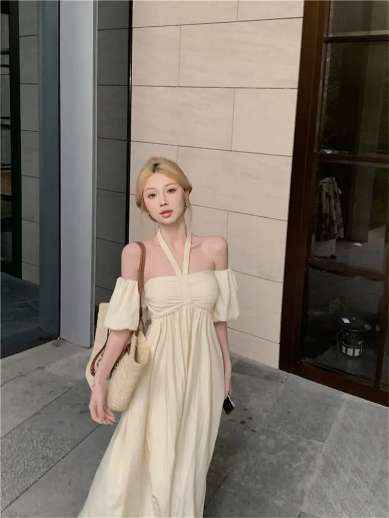 Lunivop Y2k Korean Beige Long Resort Dress Women Beach Style Off Shoulder Short Sleeve Evening Dresses Fairy Holiday Vestidos