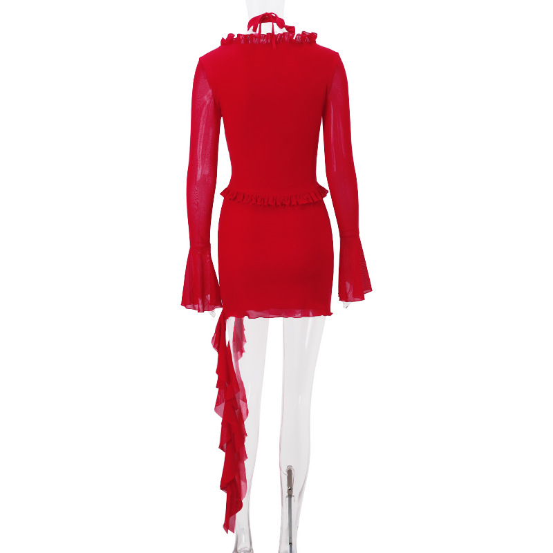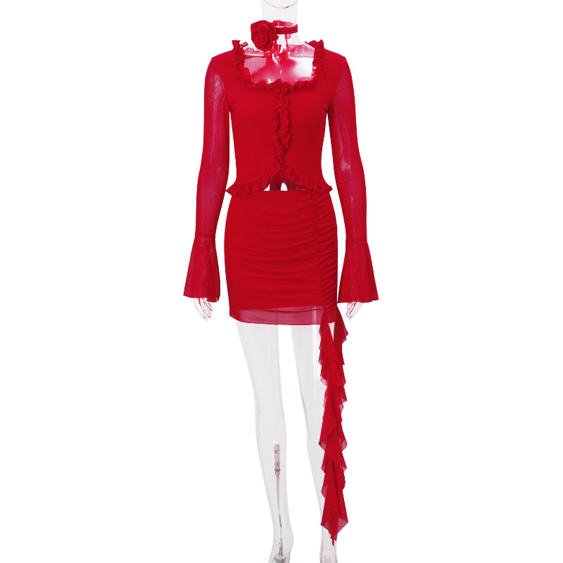 Lunivop Y2K Ruffles Slim Mesh Long Sleeve Crop Top Mini Skirts Sets Elegant Outfits Tie Front Tops and Skirt 2 Piece Matching Sets