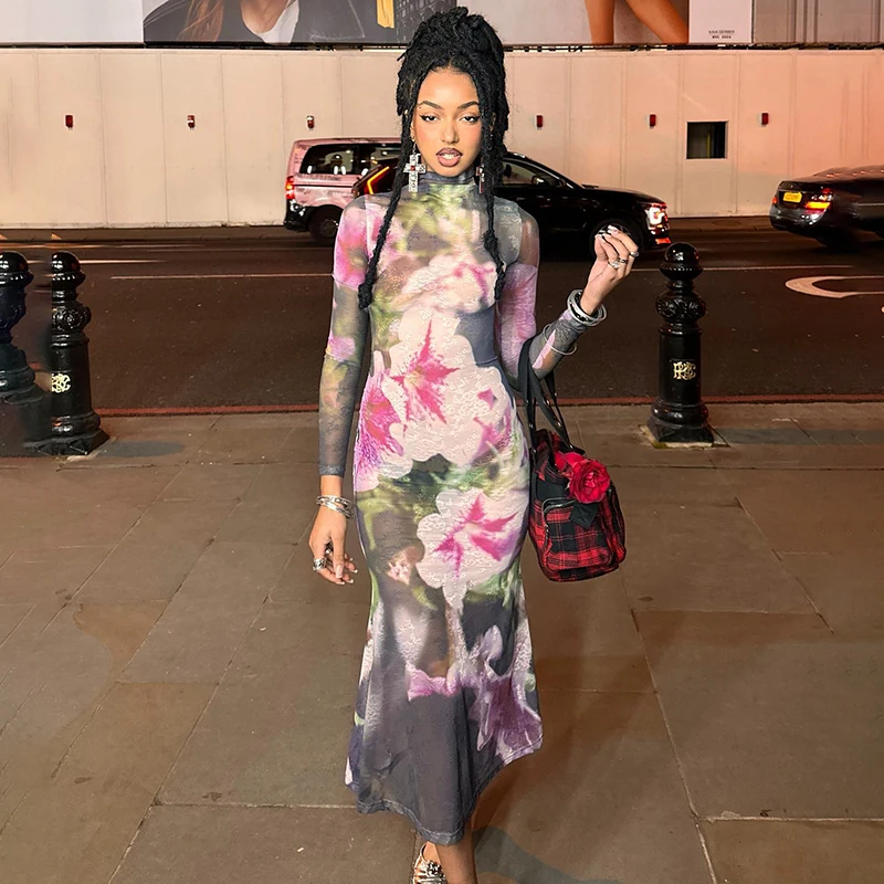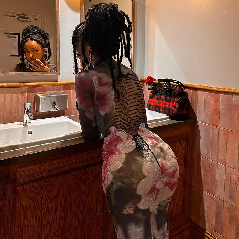 Lunivop Y2K Sexy Floral Print Backless Bandage Bodycon Mesh Sheer Party Dresses Fashion Lace-Up Long Sleeve Long Dresses Women