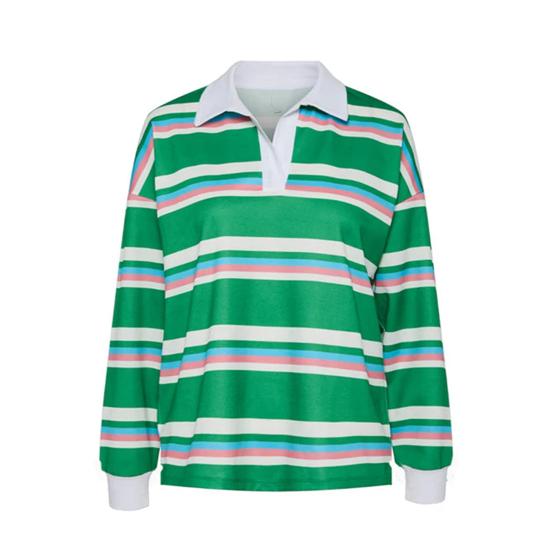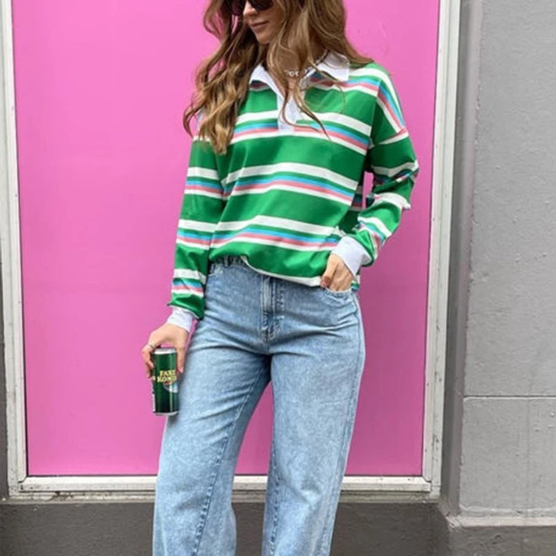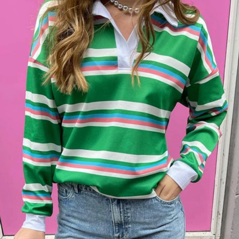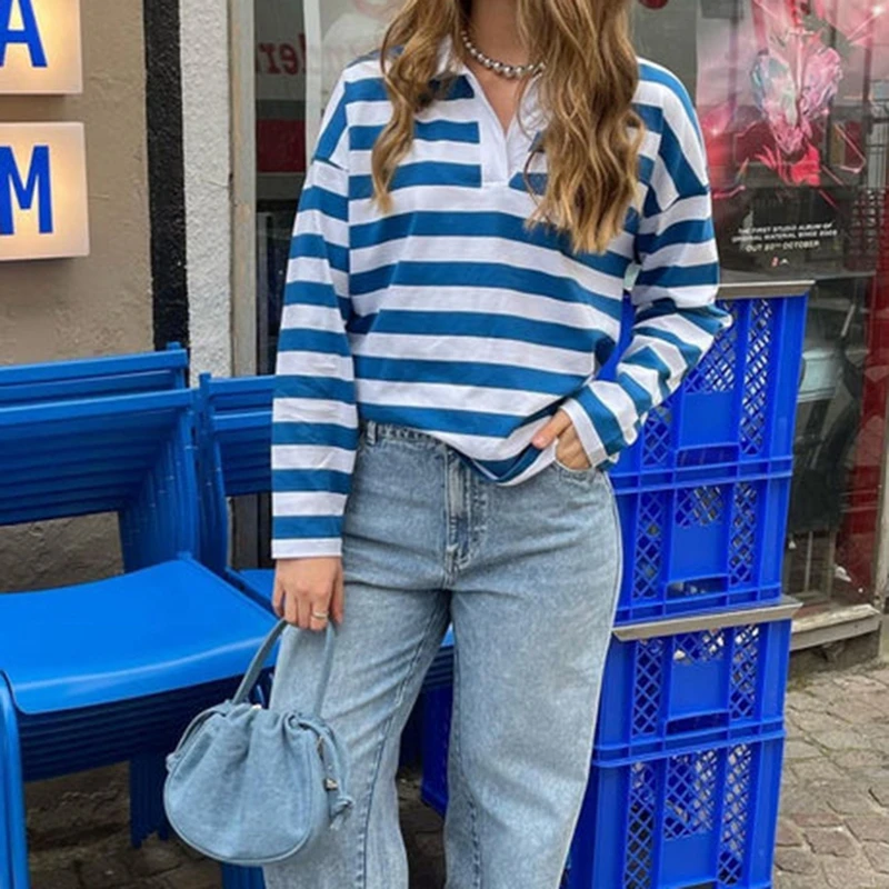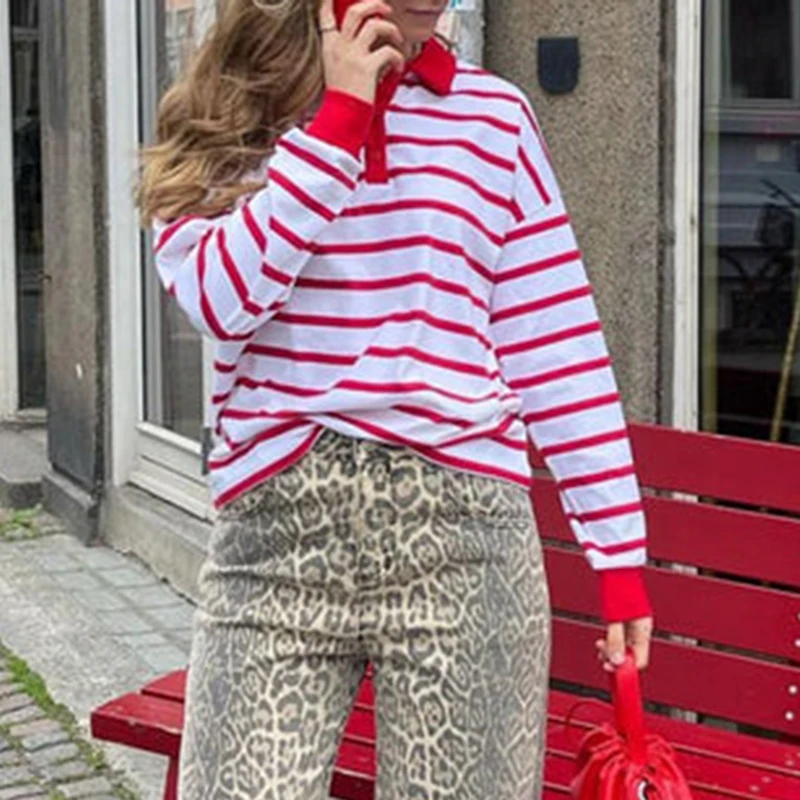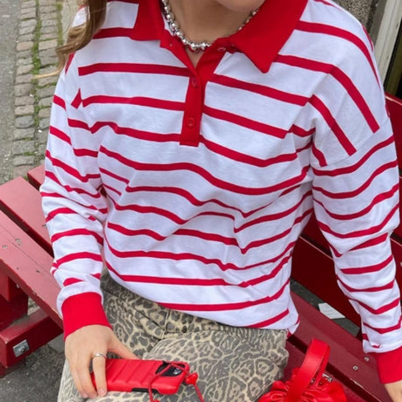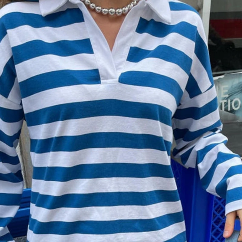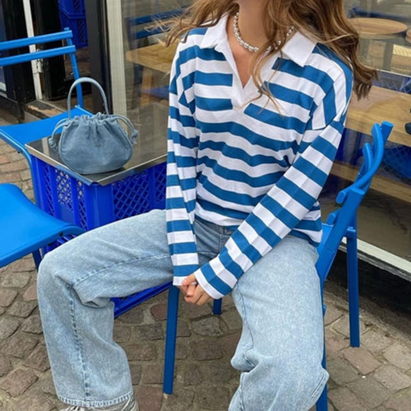 Lunivop Y2K Streetwear 90s Vintage Loose Fit Tees Autumn Striped Lapel V Neck T-shirt Women Long Sleeve Blouse Tees Casual Clothes