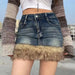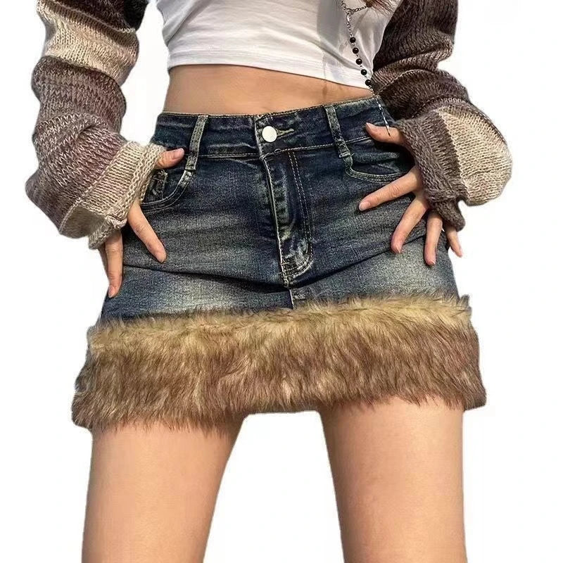 Lunivop Y2k Vintage Denim Skirt Women Sexy Harajuku Fur Patchwork Mini Skirts Retro Slim Up Streetwear A-line Short Skirts