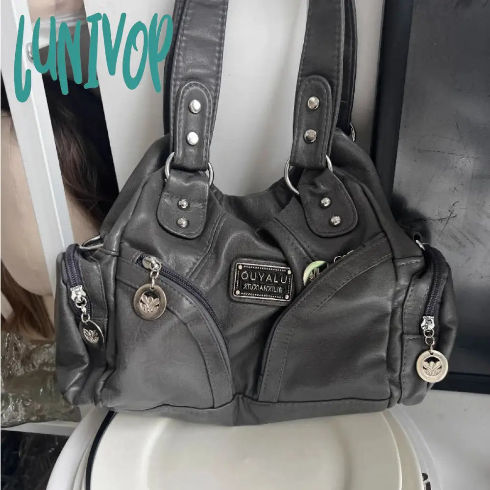 Lunivop Y2k Vintage Shoulder Bag for Women Large Capacity Gothic Soft Pu Leather Motorcycle Handbag Casual Gray Mens Armpit Bag