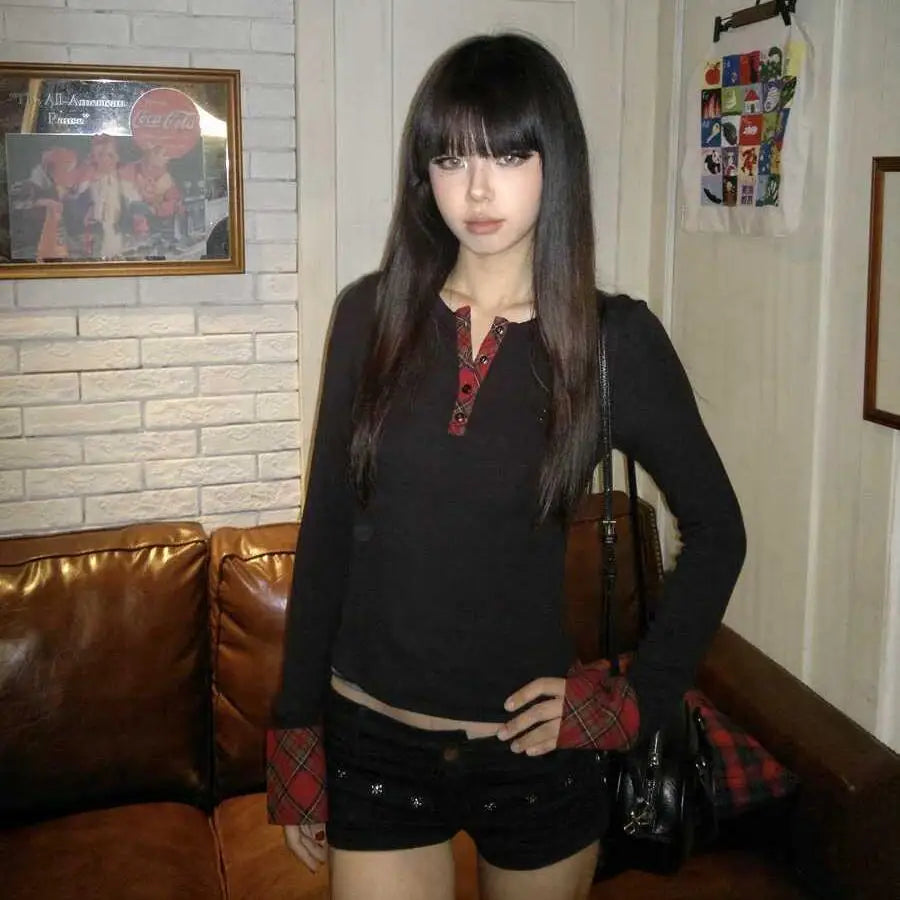 Lunivop Y2k Vintage T Shirt Women Pathwork Long Sleeve Skinny Plaid Grunge Tops Streetwear American Retro 90s Tshirts Autumn