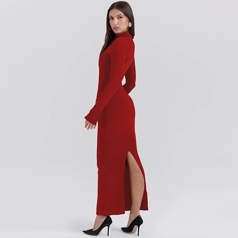Lunivop Long Sleeve Elegant Evening Patchwork Zipper Bodycon Long Dress Winter Casual Clothes Wholesale Slit Back Y2K Outfit