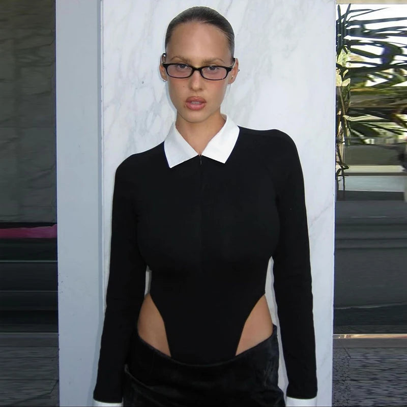 Lunivop Turn Down Collar Long Sleeve Zip Up One Piece Bodysuit Block Color Button Korean Fashion Y2K Streetwear Casual Clothes