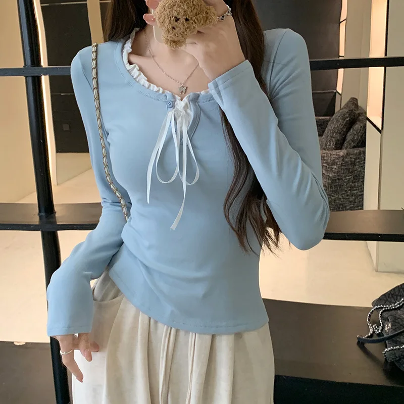 Lunivop Millennial Style Y2k Wood Ear Edge Strap V-Neck Design Sense Fake Two Base T-Shirt Women Feel Slim-Fit Short Long-Sleeved Top