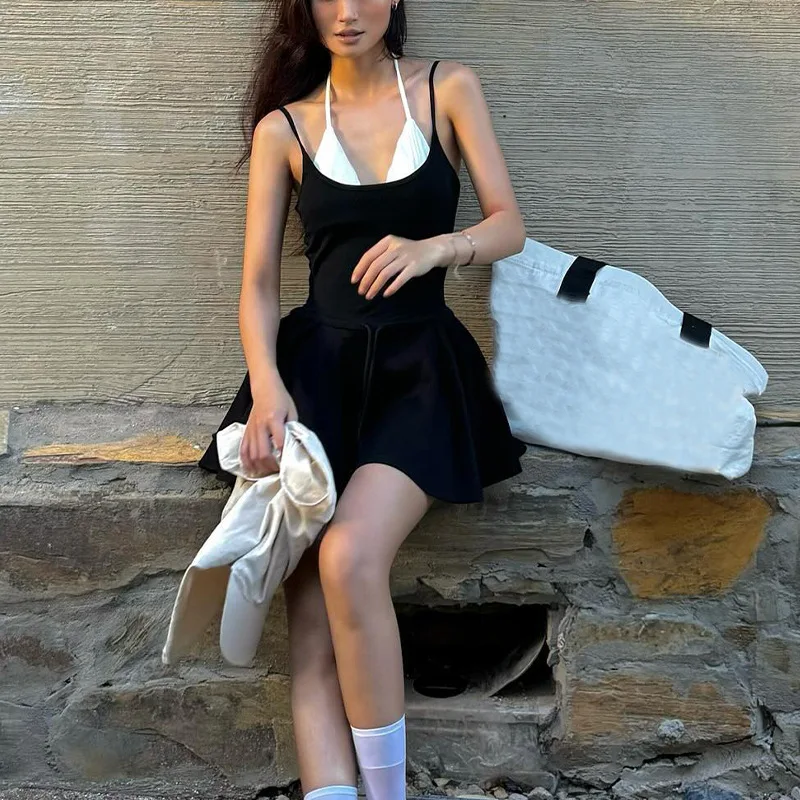 Lunivop Sexy Backless Women Fake Two Piece Sets Black Spaghetti Strap V-neck Dress Female Summer Skinny Elegant Streetwear