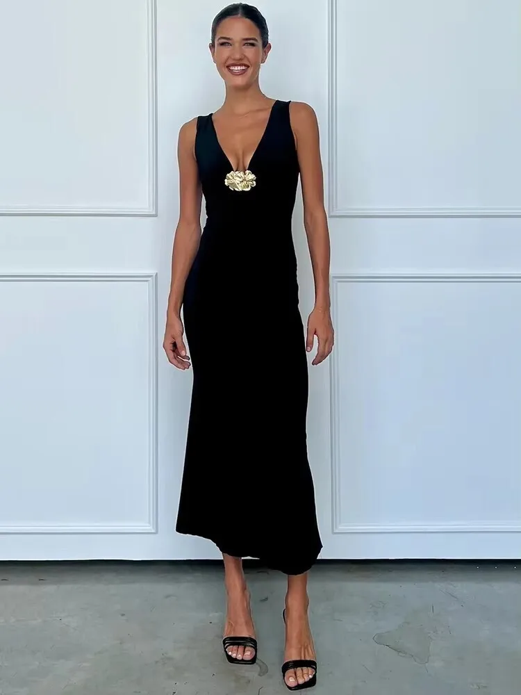 Lunivop Sexy Deep V-neck Metal Button Women Maxi Dress Black Sleeveless High Waist Dress Female Summer Skinny Elegant Beachwear