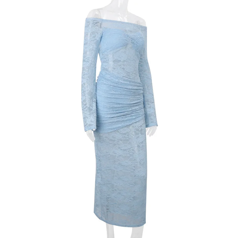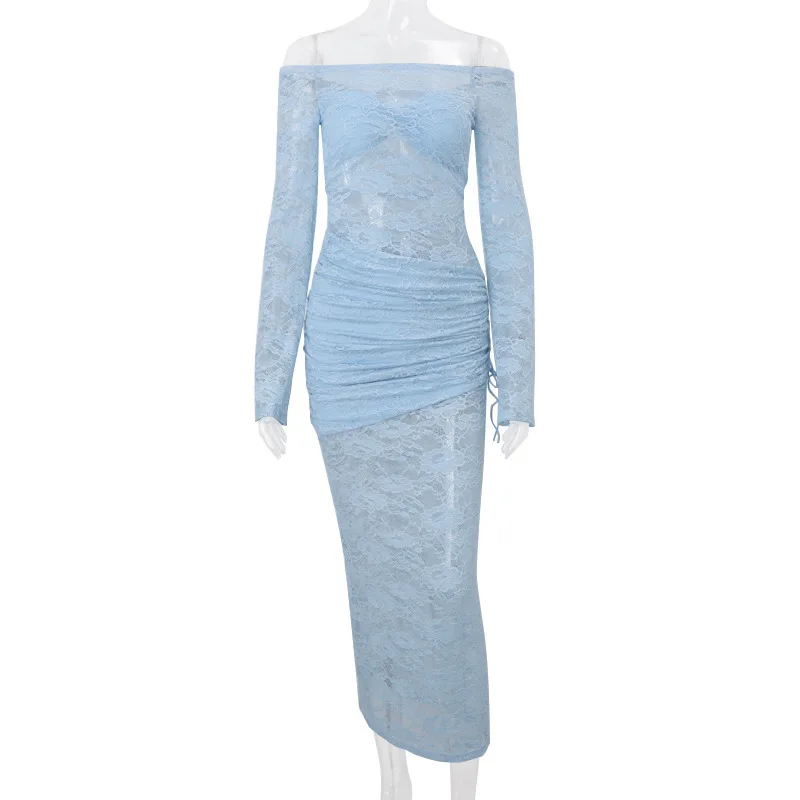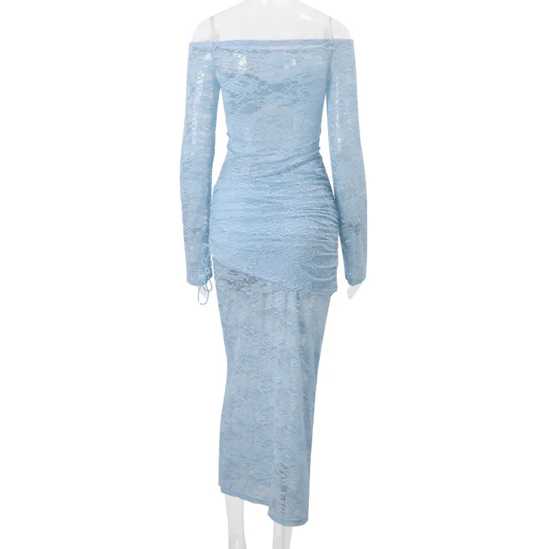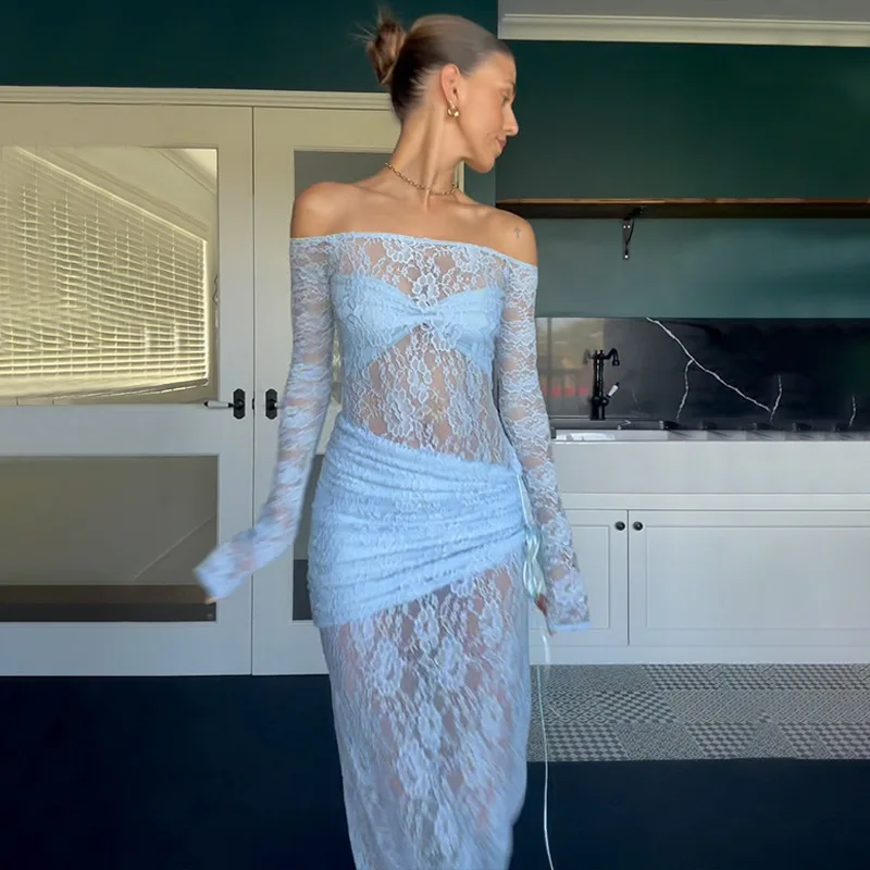 Lunivop Sexy Off Shoulder See Through Lace Women Dress Blue Long Sleeve Maxi Dress Female Spring New Elegant Party Clubwear