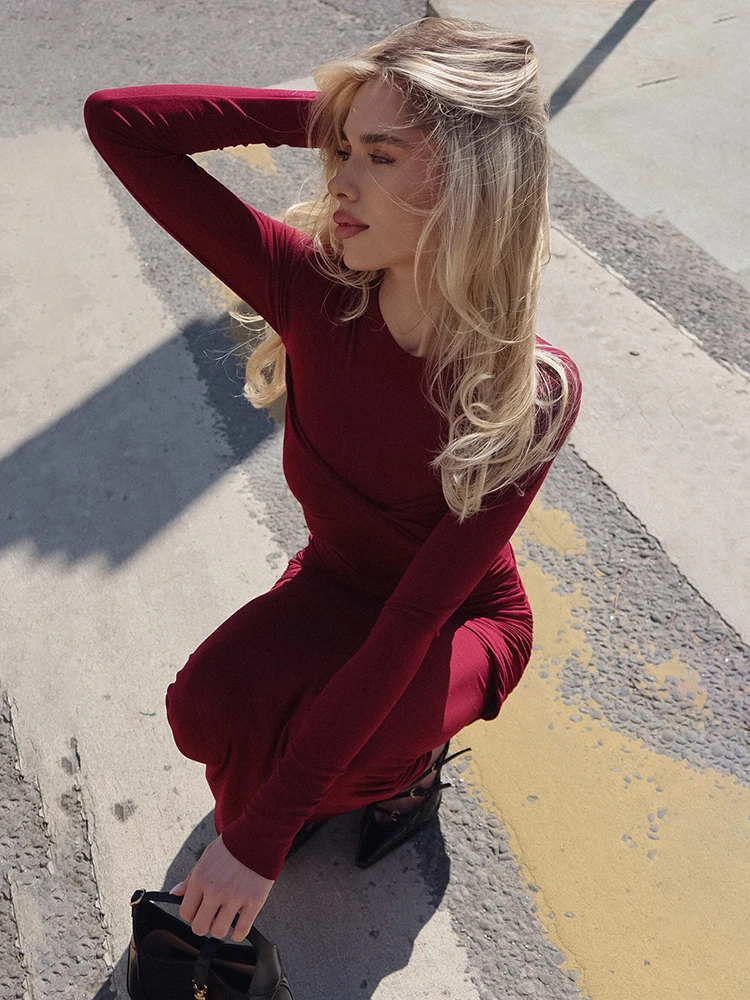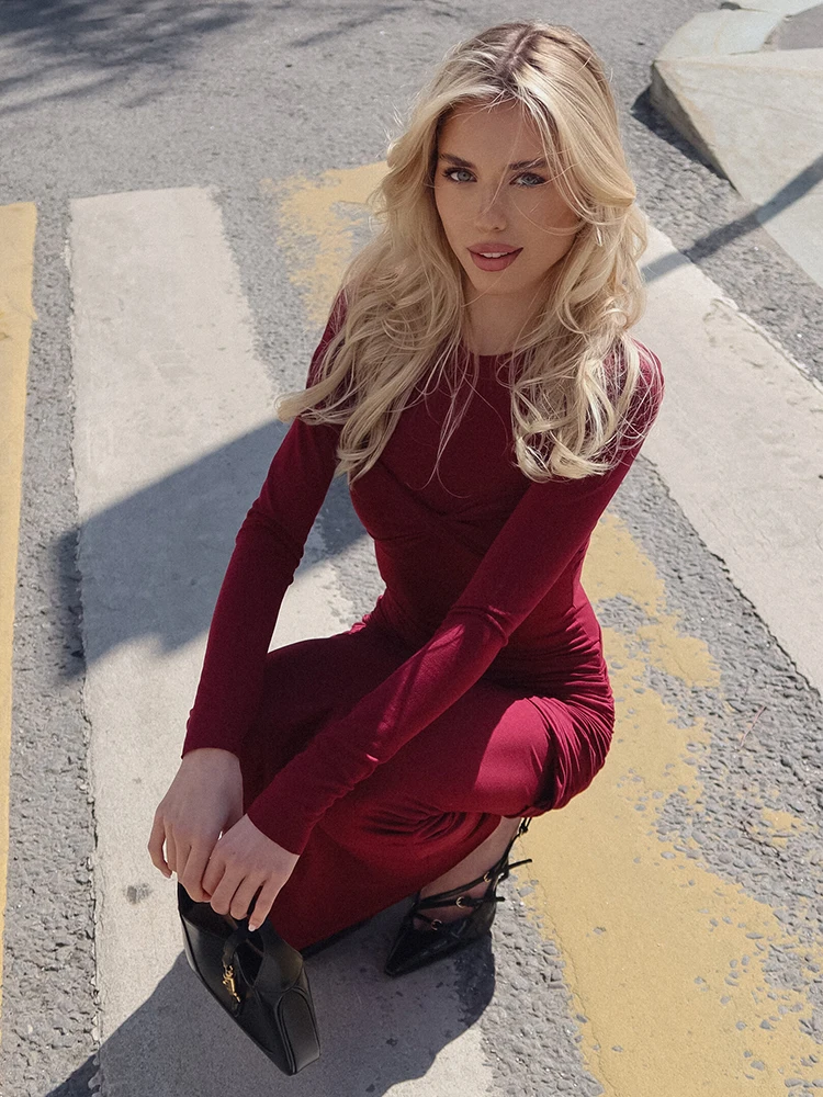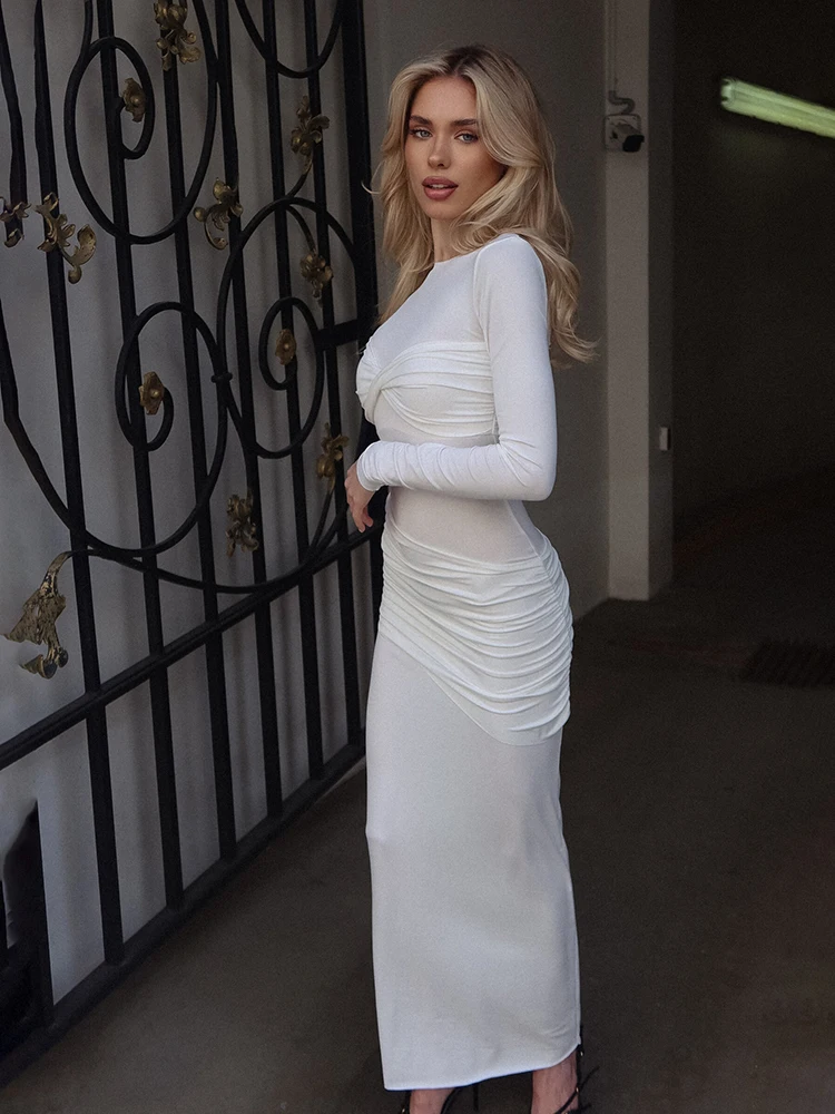 Lunivop Sexy Round Neck Ruched Knot Women Maxi Dress White Long Sleeve Evening Dress Female Autumn Skinny Elegant Party Clubwear