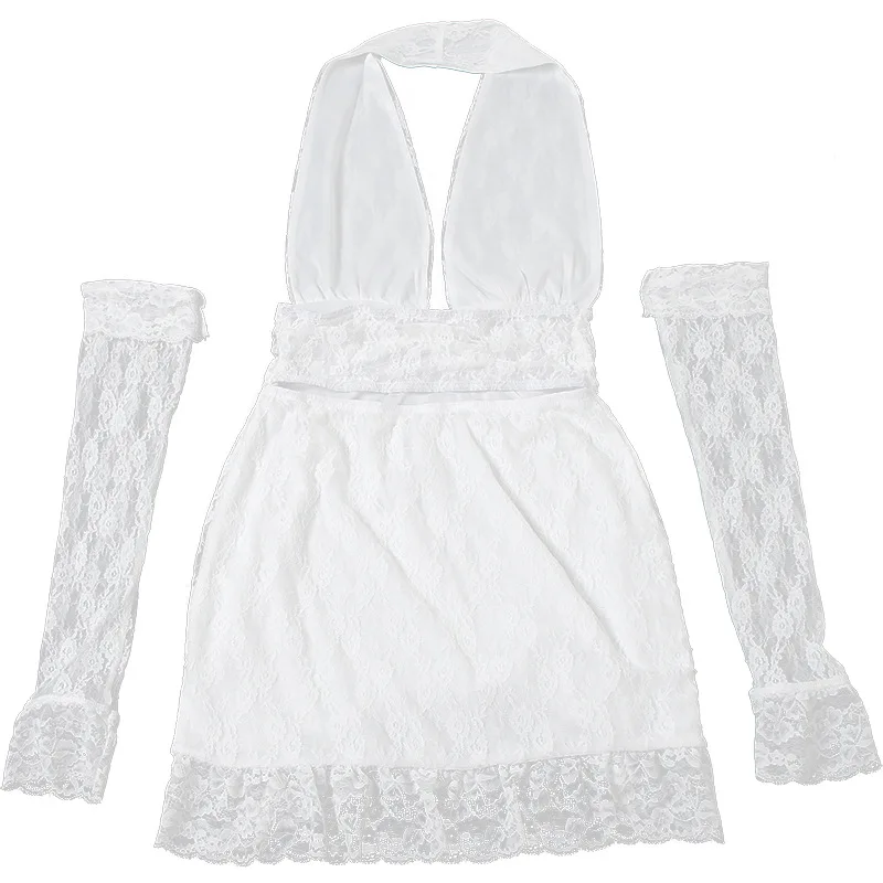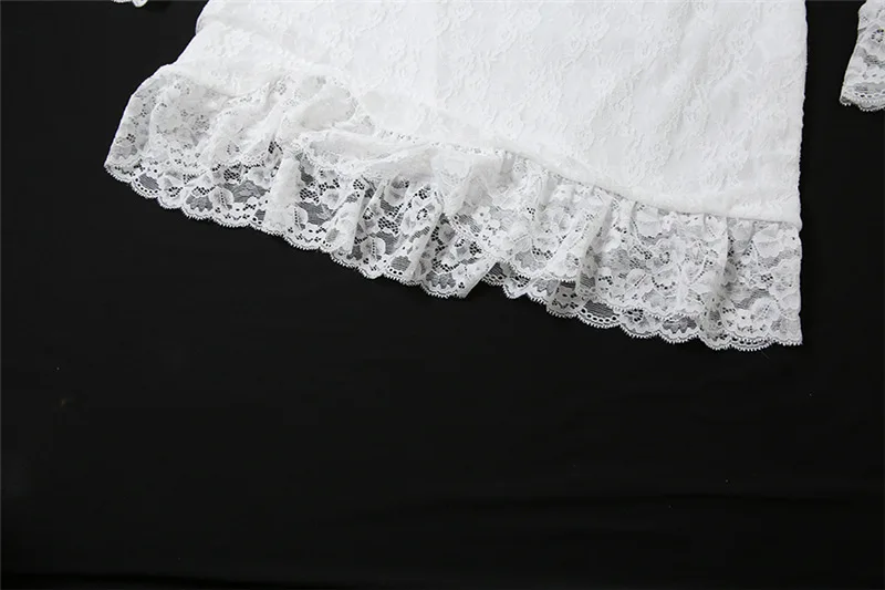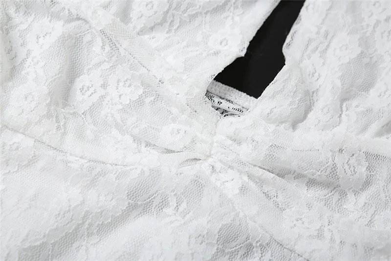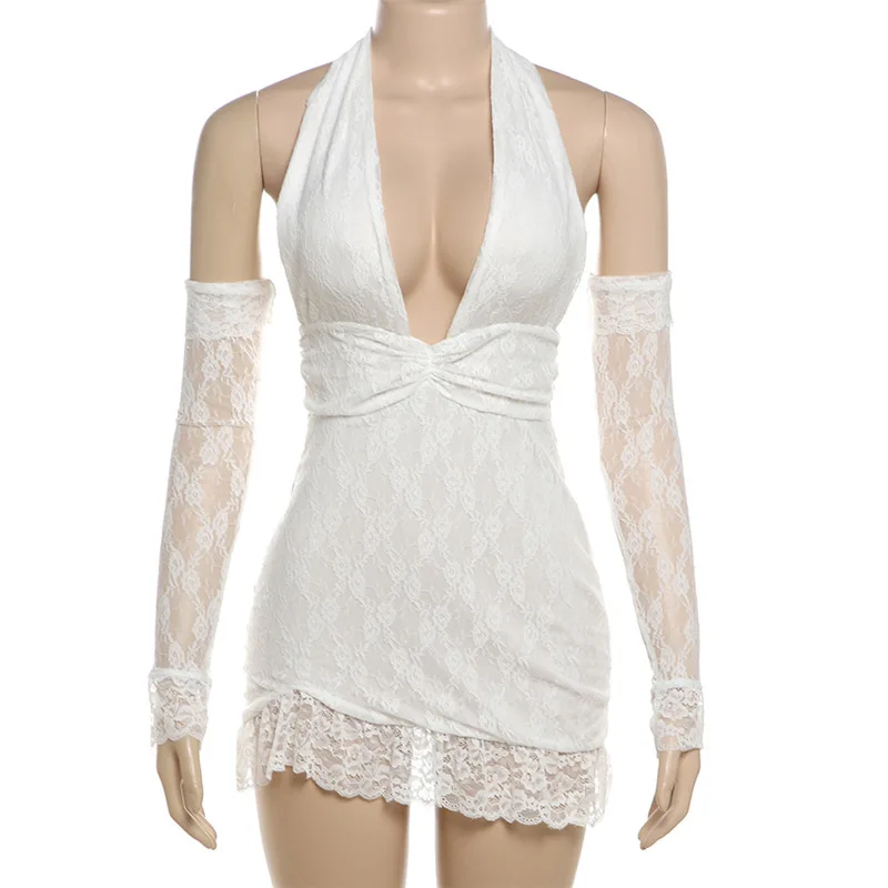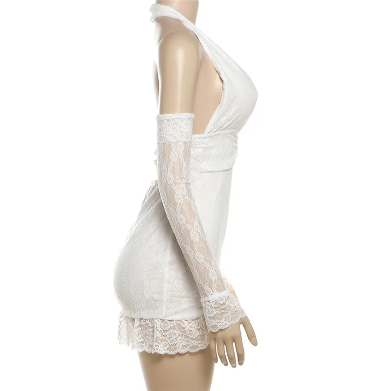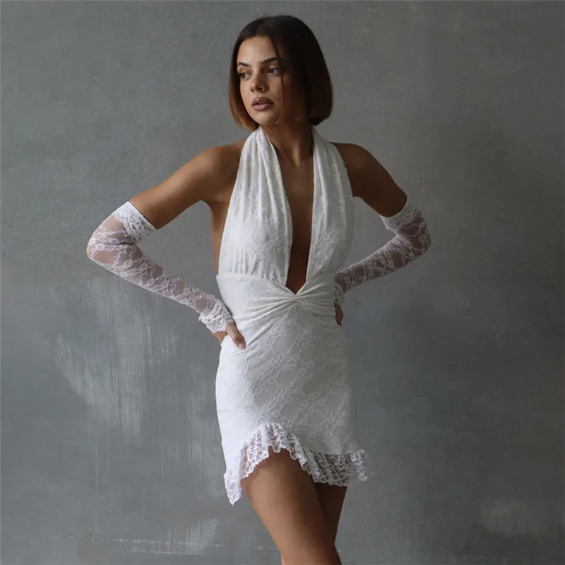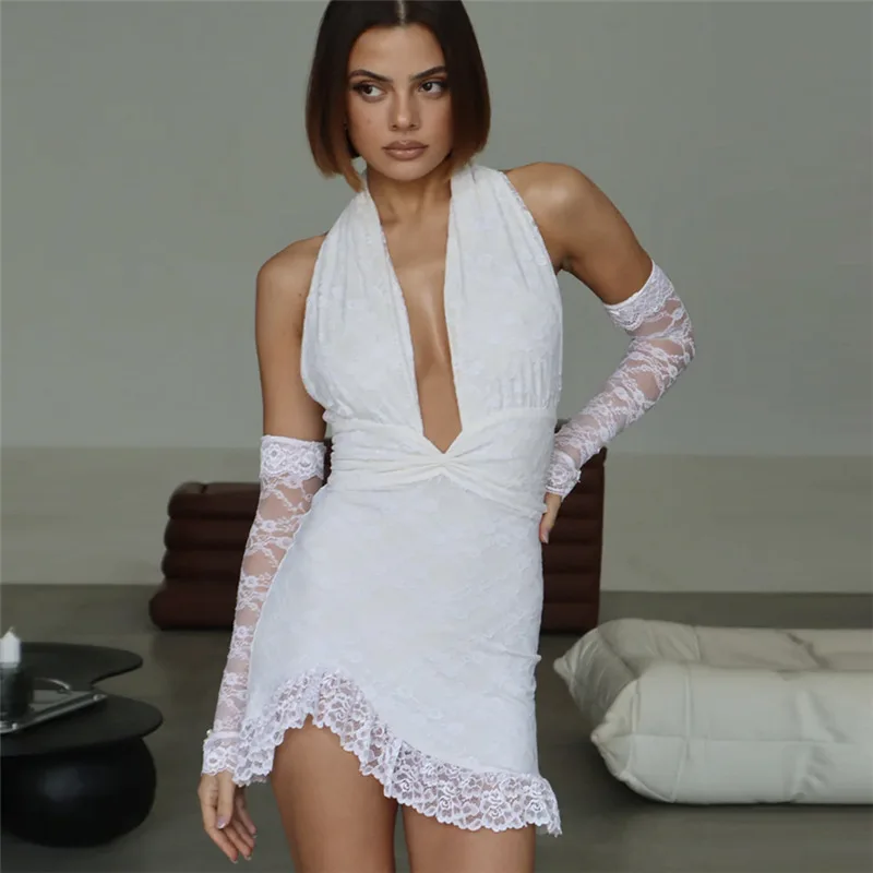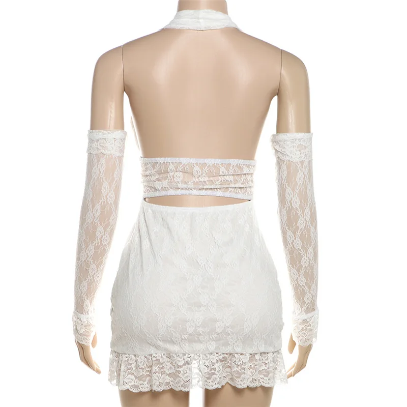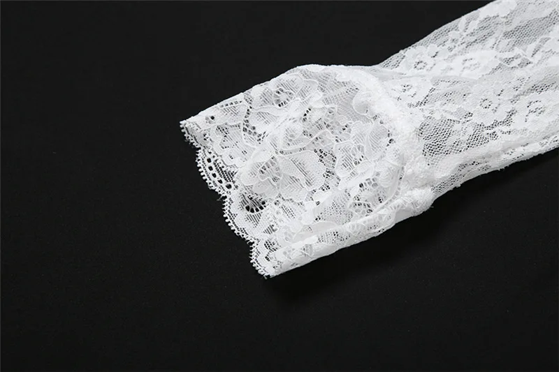 Lunivop Sexy See Through Lace Women Dress White Off Shoulder Deep V-neck Gloves Dress Summer Skinny Elegant Party Clubwear
