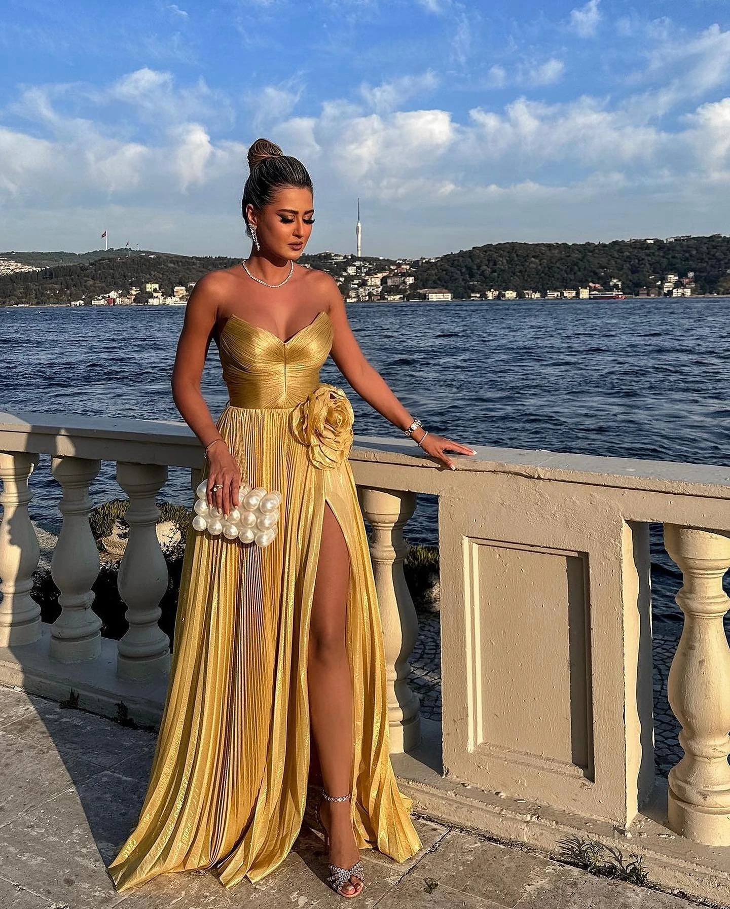 Lunivop Shiny Strapless Golden Flods Evening Dress With Slit Custom Made Pleated Prom Party Dress With Flower Ever Pretty Woman Clothes