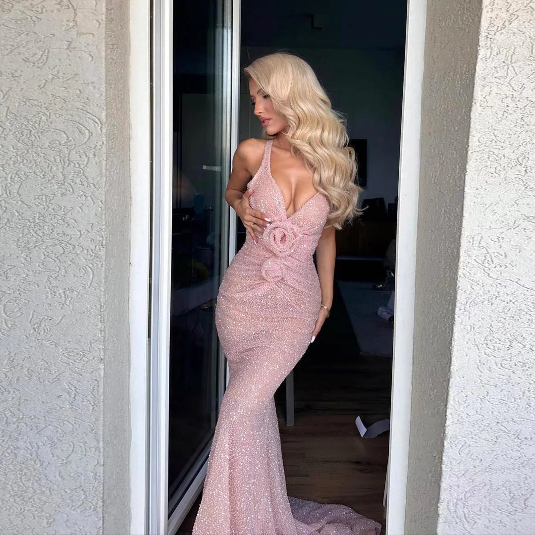 Lunivop Sparkle V-neck Sequins Light Pink See Through Mermaid Dress Floor Length Prom Dresses Custom Made Ever Pretty Evening Dresses