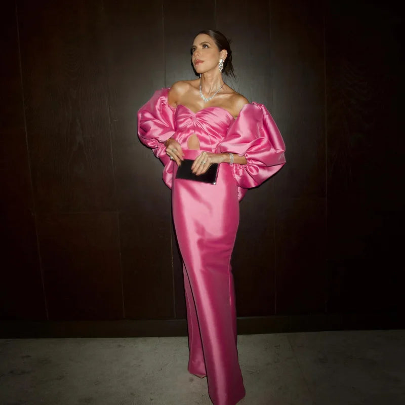 Lunivop Trendy Bubblegum Pleated Satin Long Evening Gowns Off Shoulders Puffy Sleeve Sweetheart Mermaid Banquet Dress Celebrity Dress
