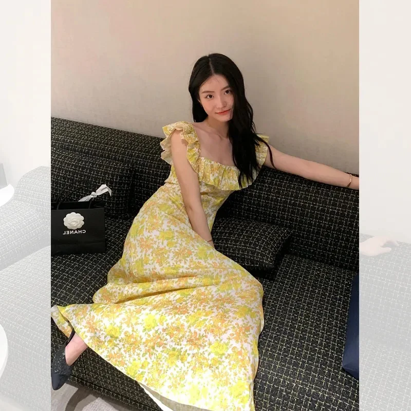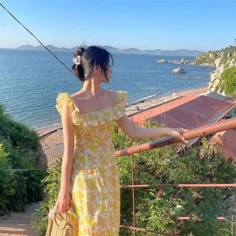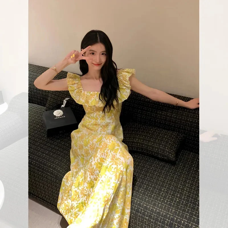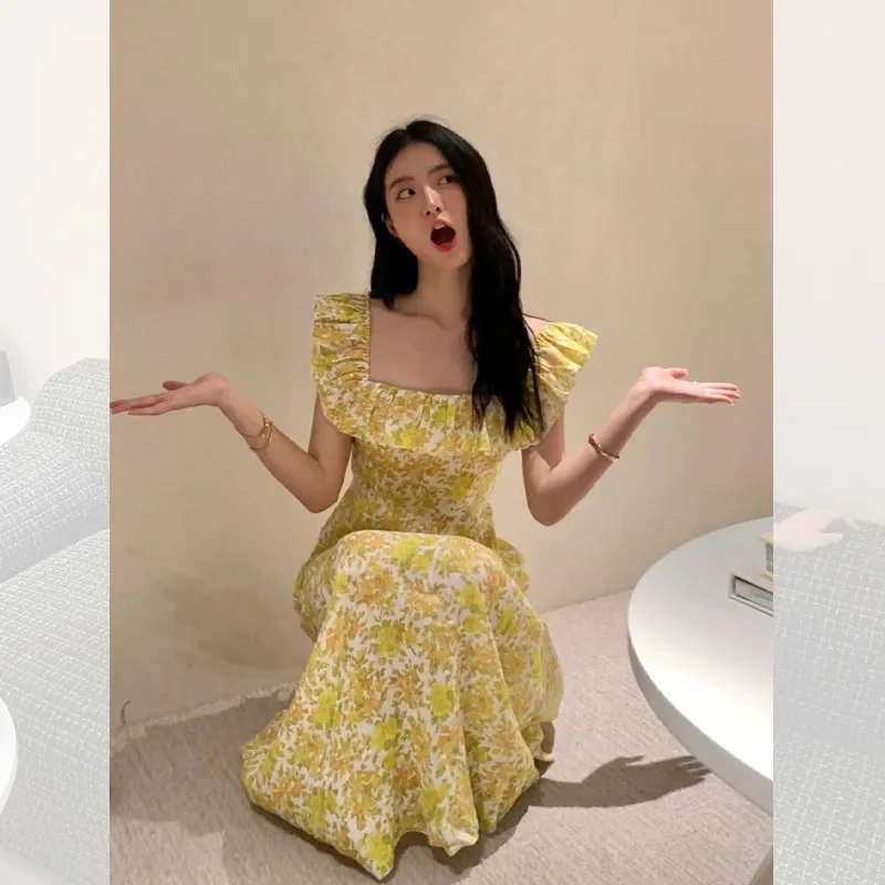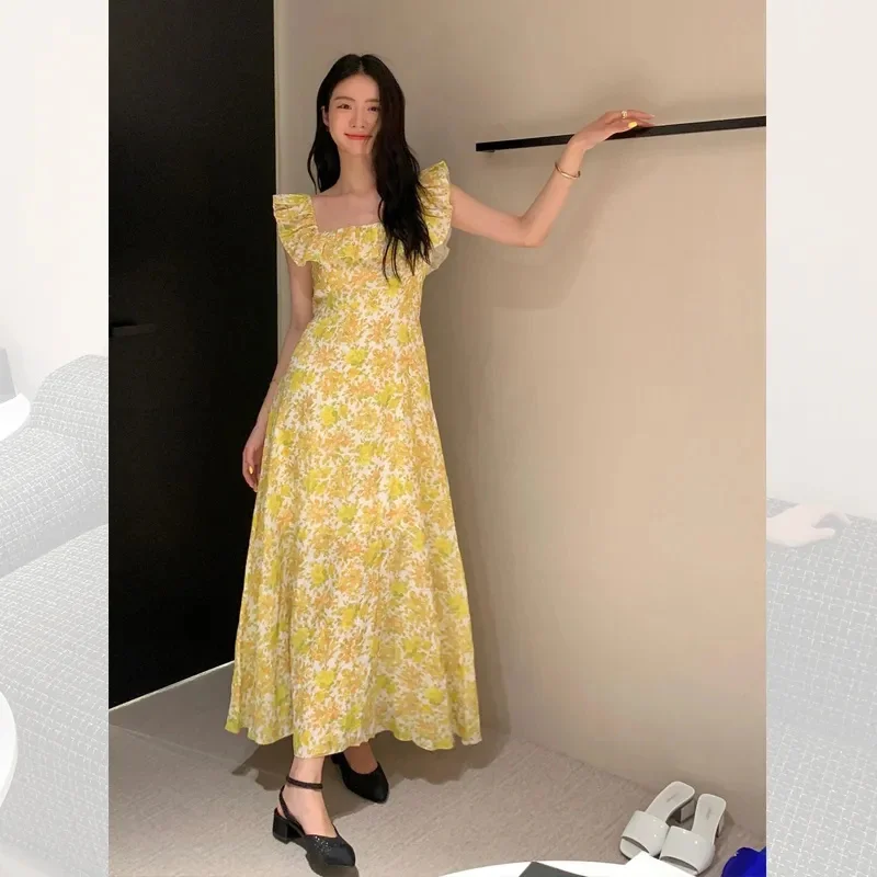 Lunivop Korean Fashion Yellow Floral Long Dress Women's Summer Flying Sleeves Square Neck Maxi Dress Party Night Vacation Midi Dress