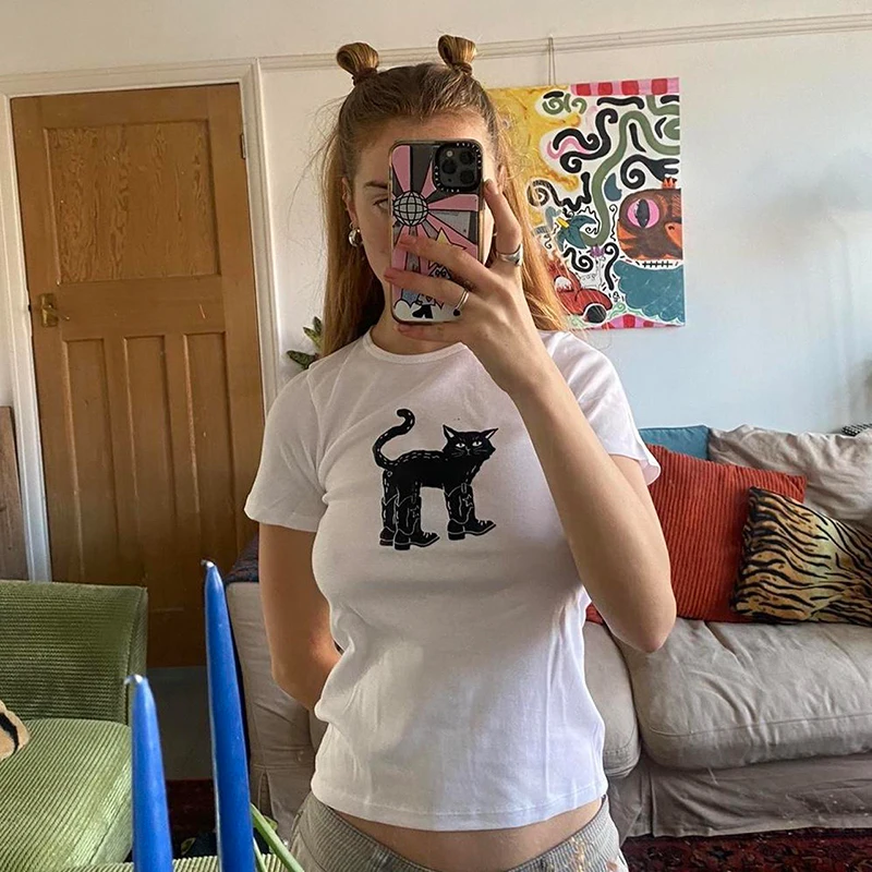 Lunivop Women T-Shirt Funny black Cat Print Slim Graphic Gothic Summer Korean Fashion Cute Baby Tee Harajuku Vintage Women's Streetwear