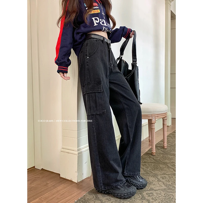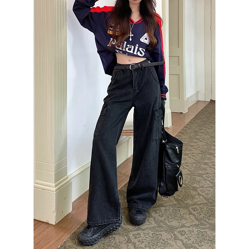 Lunivop Women Vintage High Waist Loose Pockets Jeans Streetwear Trashy Style Pants 2024 Autumn Y2K Wide Leg Black Baggy Denim Trouser