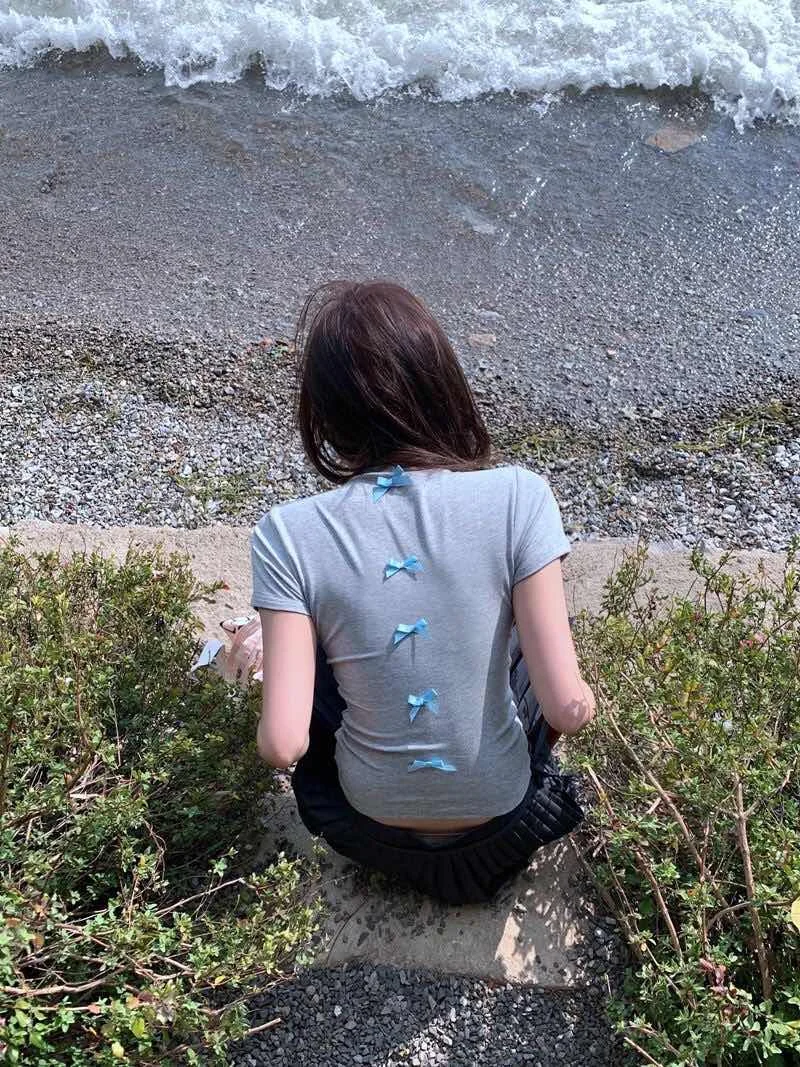 Lunivop Y2k Millenial Bow Hot Drill Half High Neck Sexy Slim Short Sleeve Shoulder T-Shirt Pure Wind Back Bow Three-Dimensional Decorati