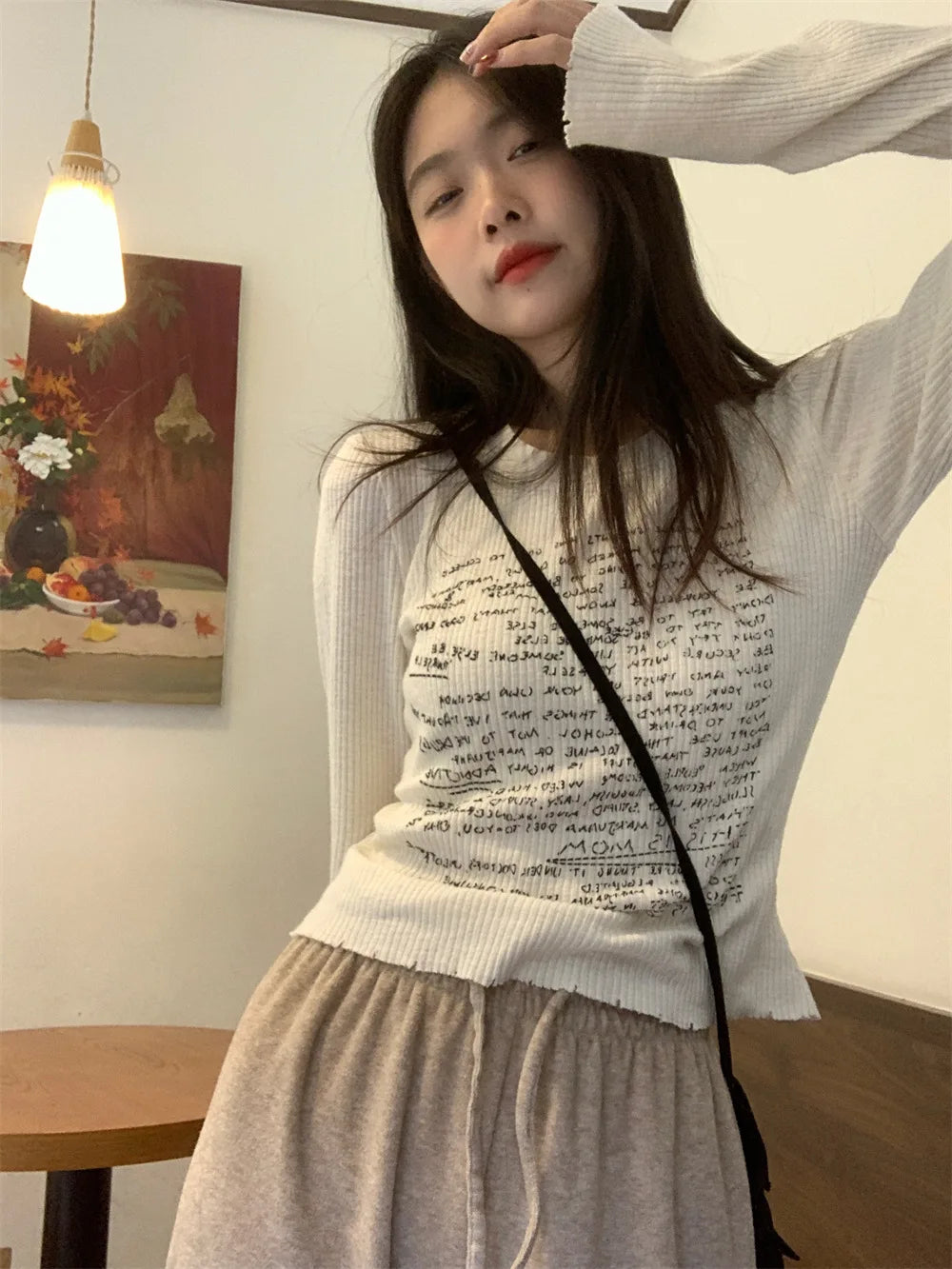 Lunivop Y2K Women Shoulder Long Sleeve Letter Printed T-shirt Round Neck T-Shirts Korean Autumn Vintage Long Sleeve Knit Fashion Tops